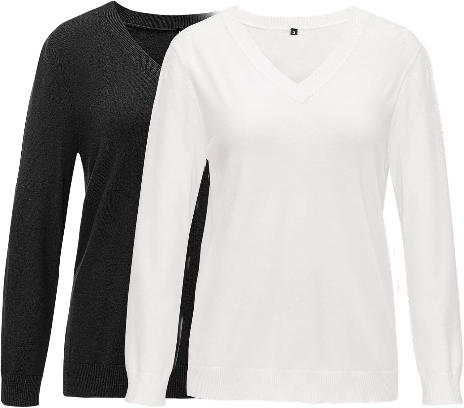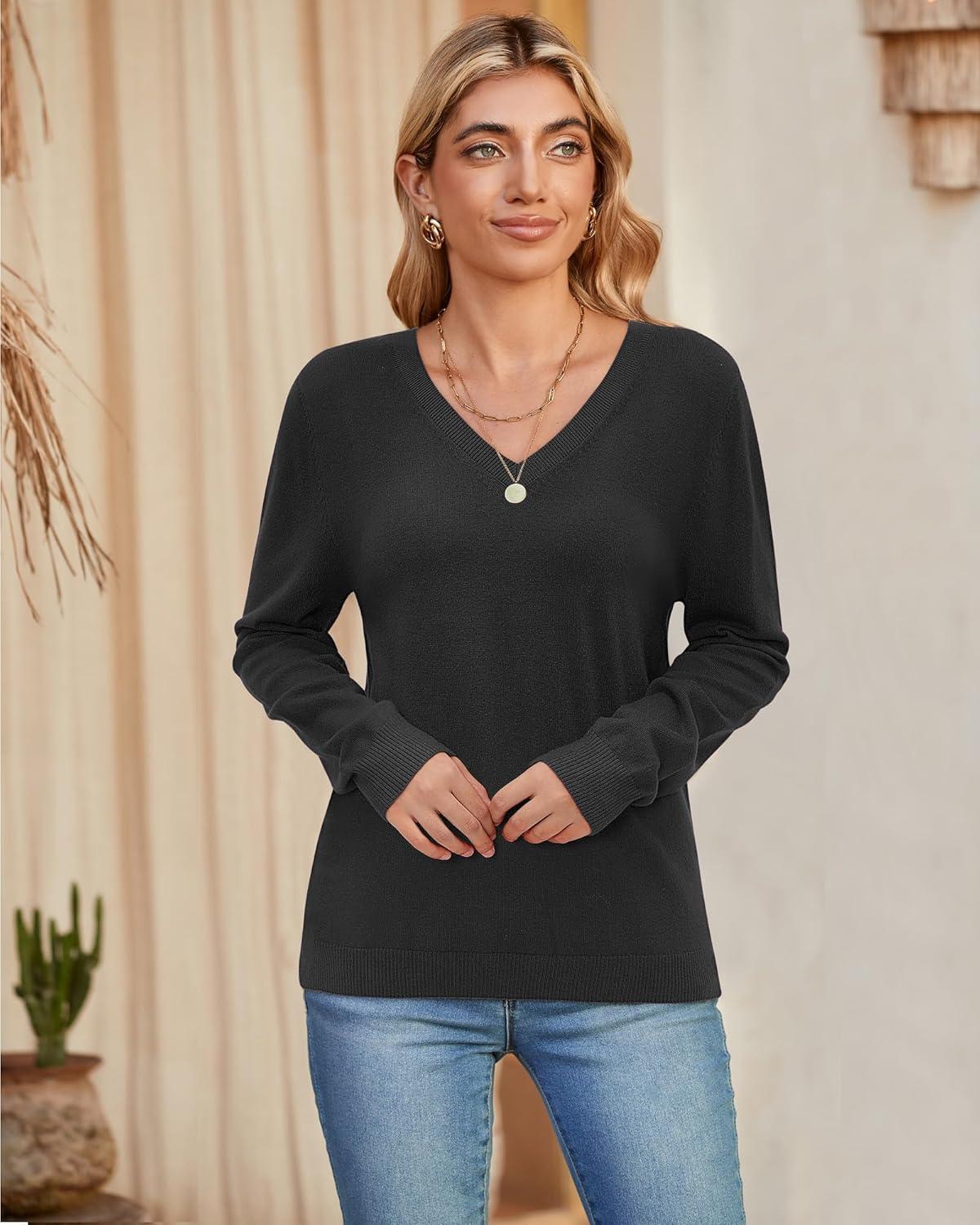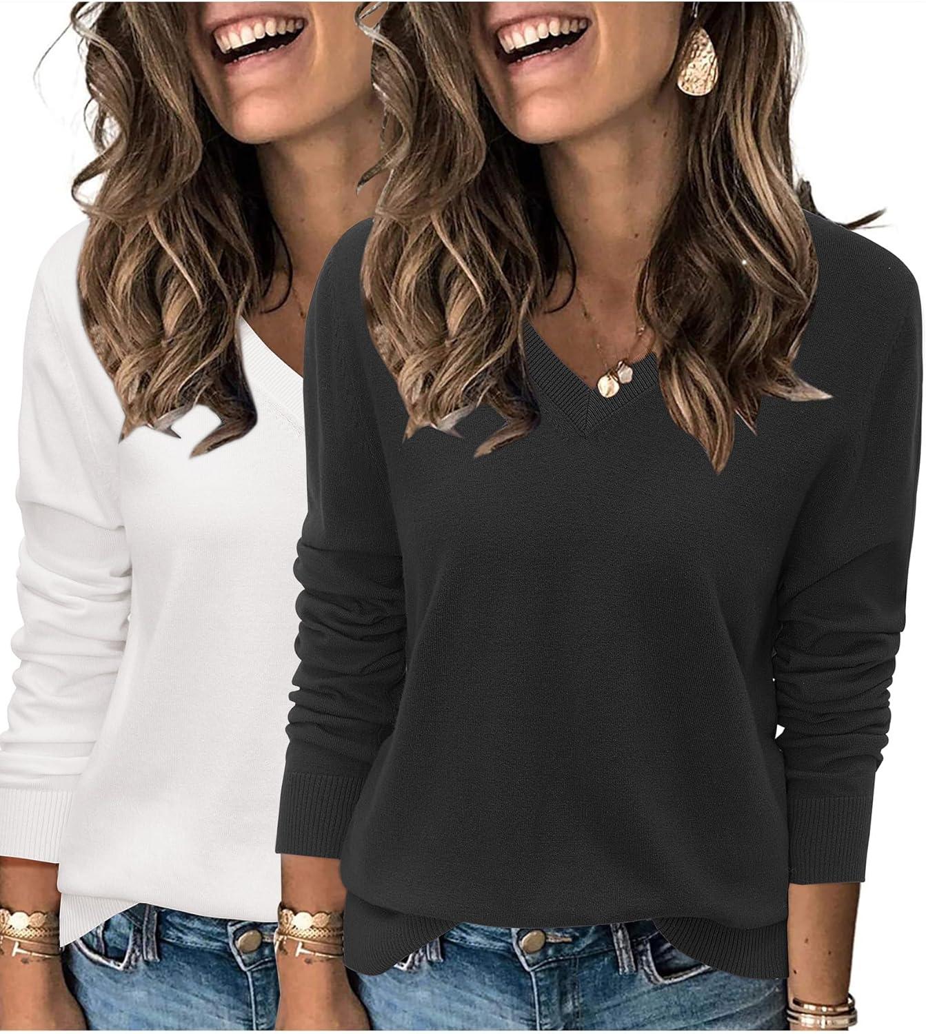 Arach&Cloz 2 Pack Womens Sweaters 2024 Lightweight Soft V Neck Long Sleeve Fall Tops Fashion Clothes Casual Shirts Pullover(Black+grey)