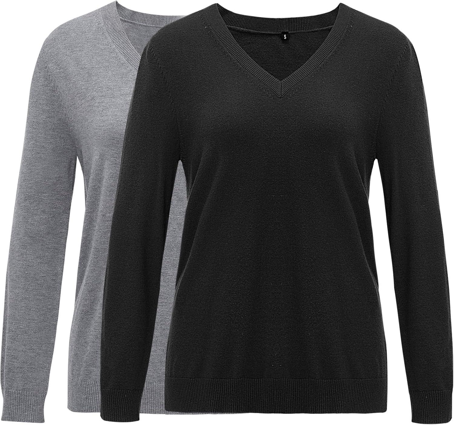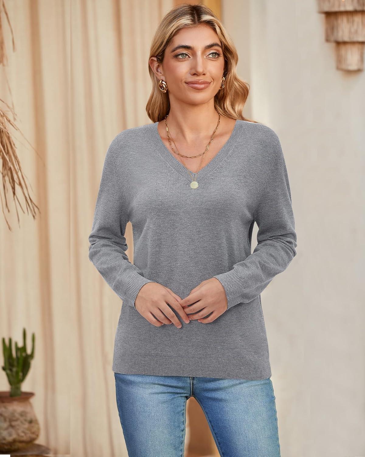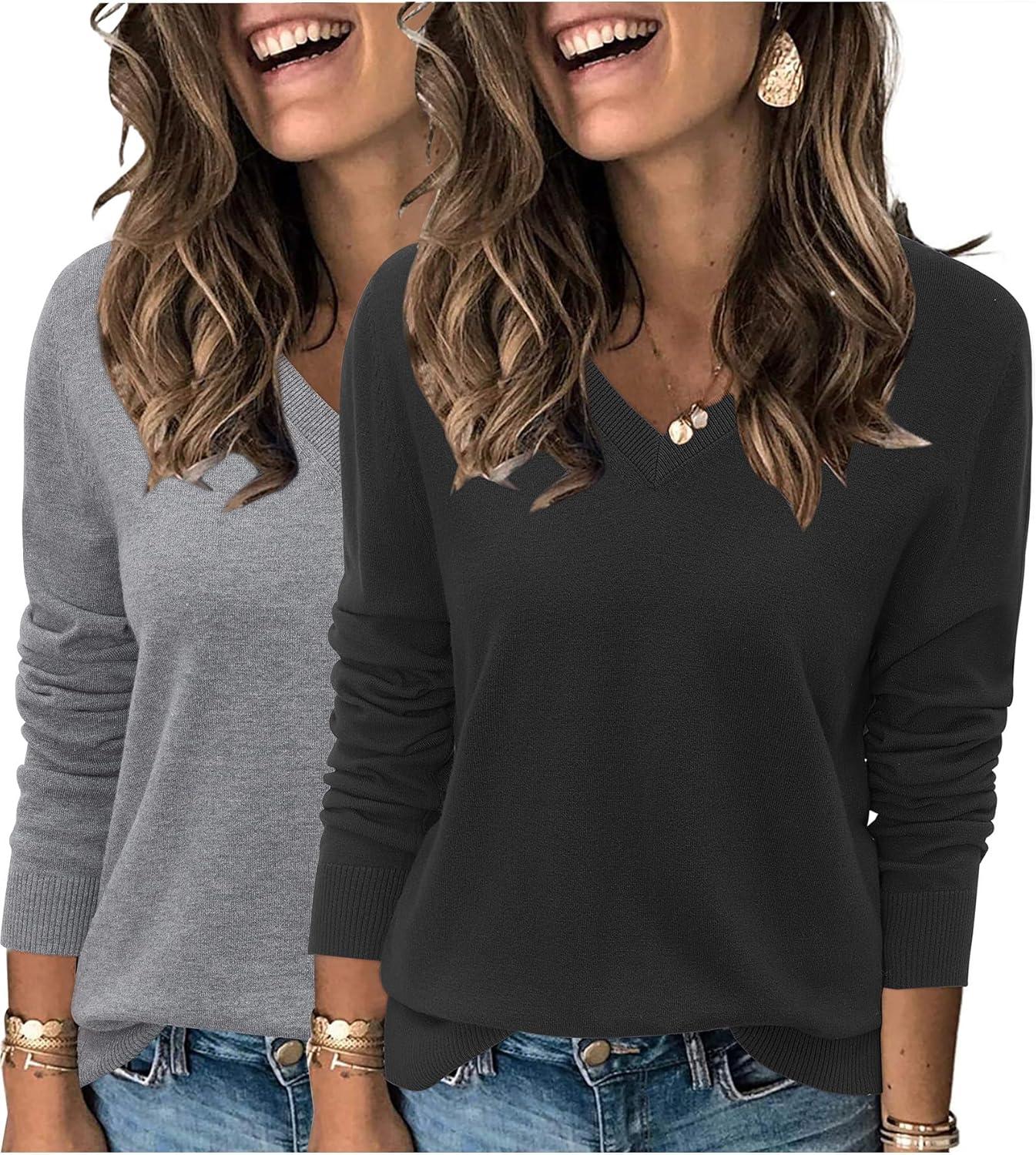 Arach&Cloz 2 Pack Womens Sweaters 2024 Lightweight Soft V Neck Long Sleeve Fall Tops Fashion Clothes Casual Shirts Pullover(Black+grey)
