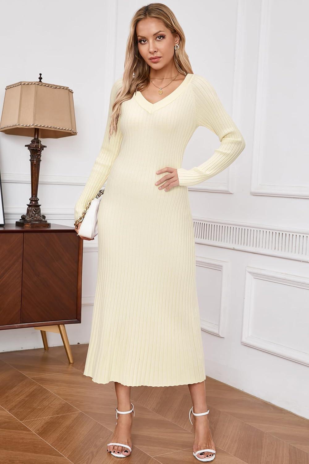 Arach&Cloz 2025 Spring Womens V Neck Long Sleeve Fishtail Sweater Dress Ribbed Knit Slim Fit Bodycon Midi Dress(Apricot Beige)
