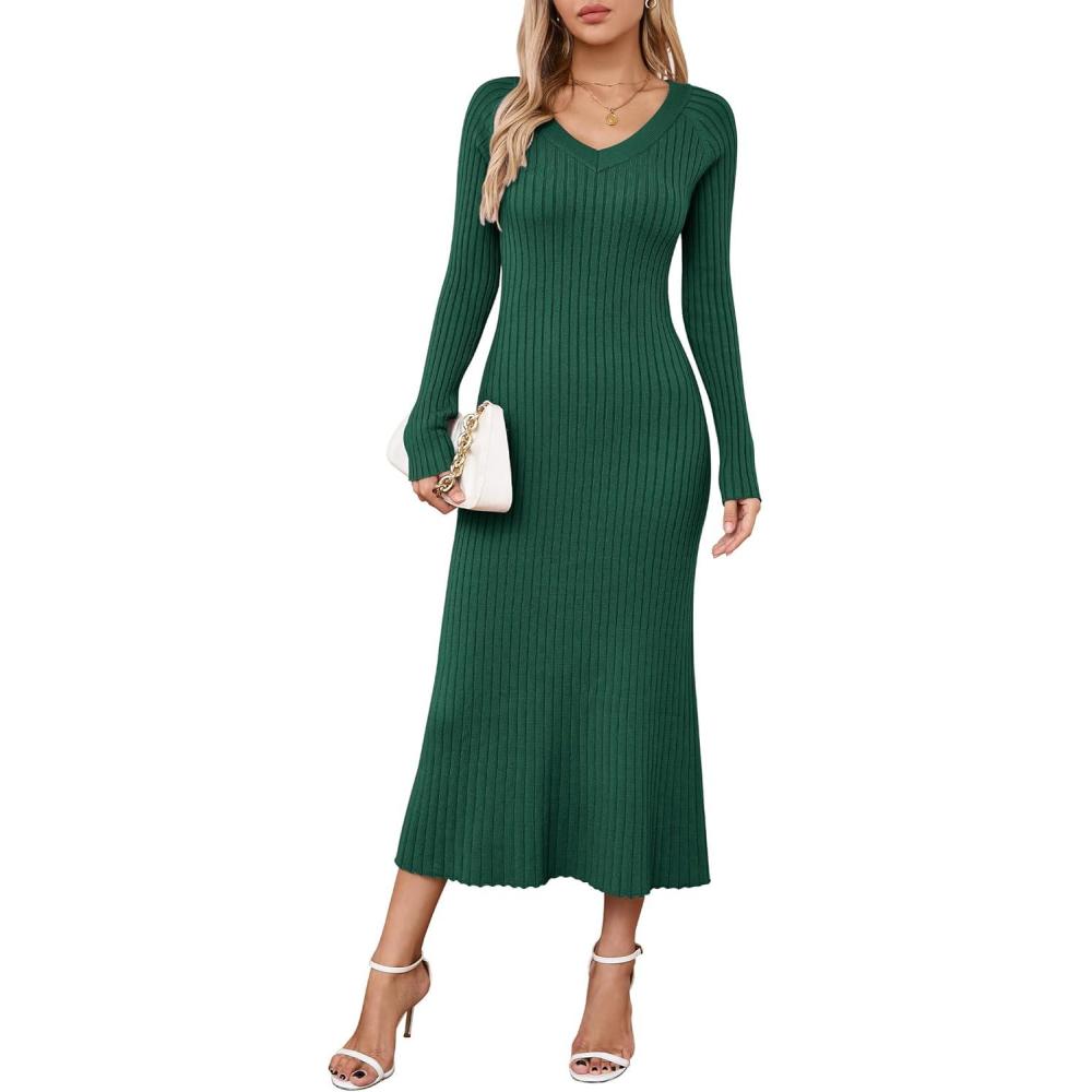 Arach&Cloz 2025 Spring Womens V Neck Long Sleeve Fishtail Sweater Dress Ribbed Knit Slim Fit Bodycon Midi Dress(Green)
