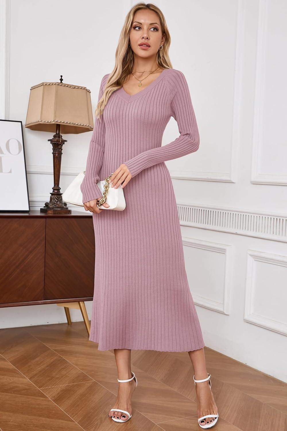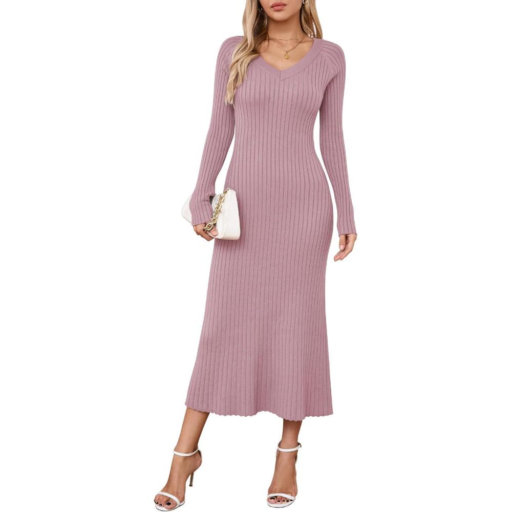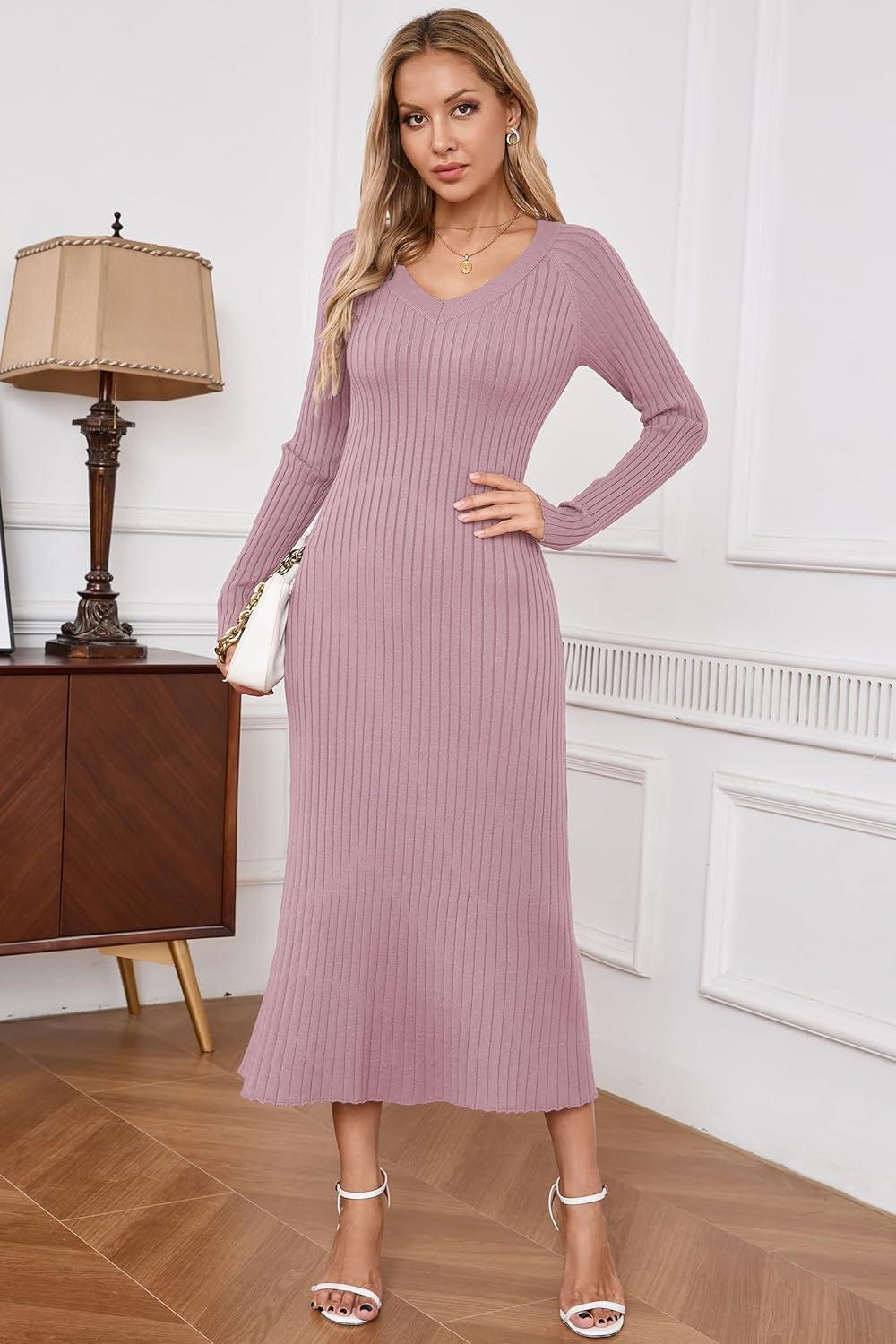Arach&Cloz 2025 Spring Womens V Neck Long Sleeve Fishtail Sweater Dress Ribbed Knit Slim Fit Bodycon Midi Dress(Pink)