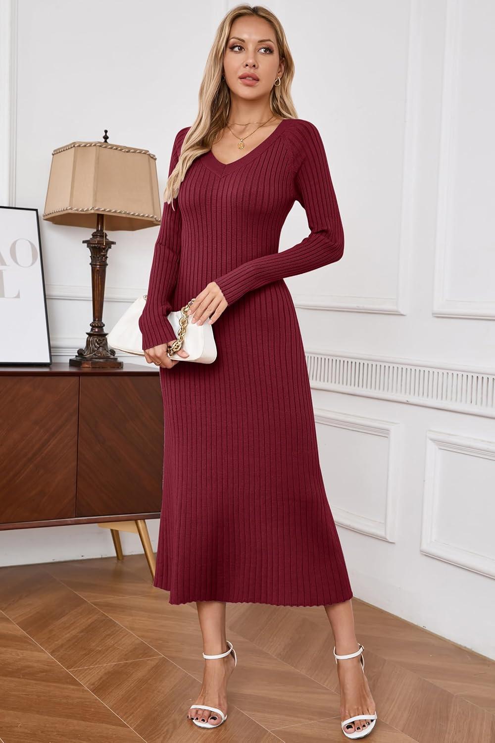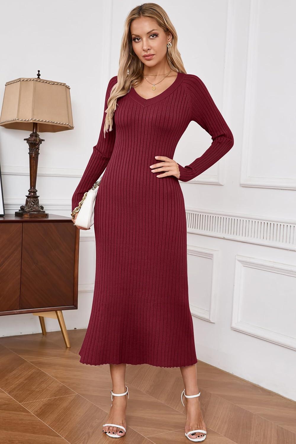 Arach&Cloz 2025 Spring Womens V Neck Long Sleeve Fishtail Sweater Dress Ribbed Knit Slim Fit Bodycon Midi Dress(Red)