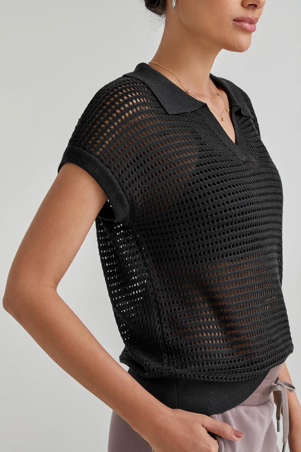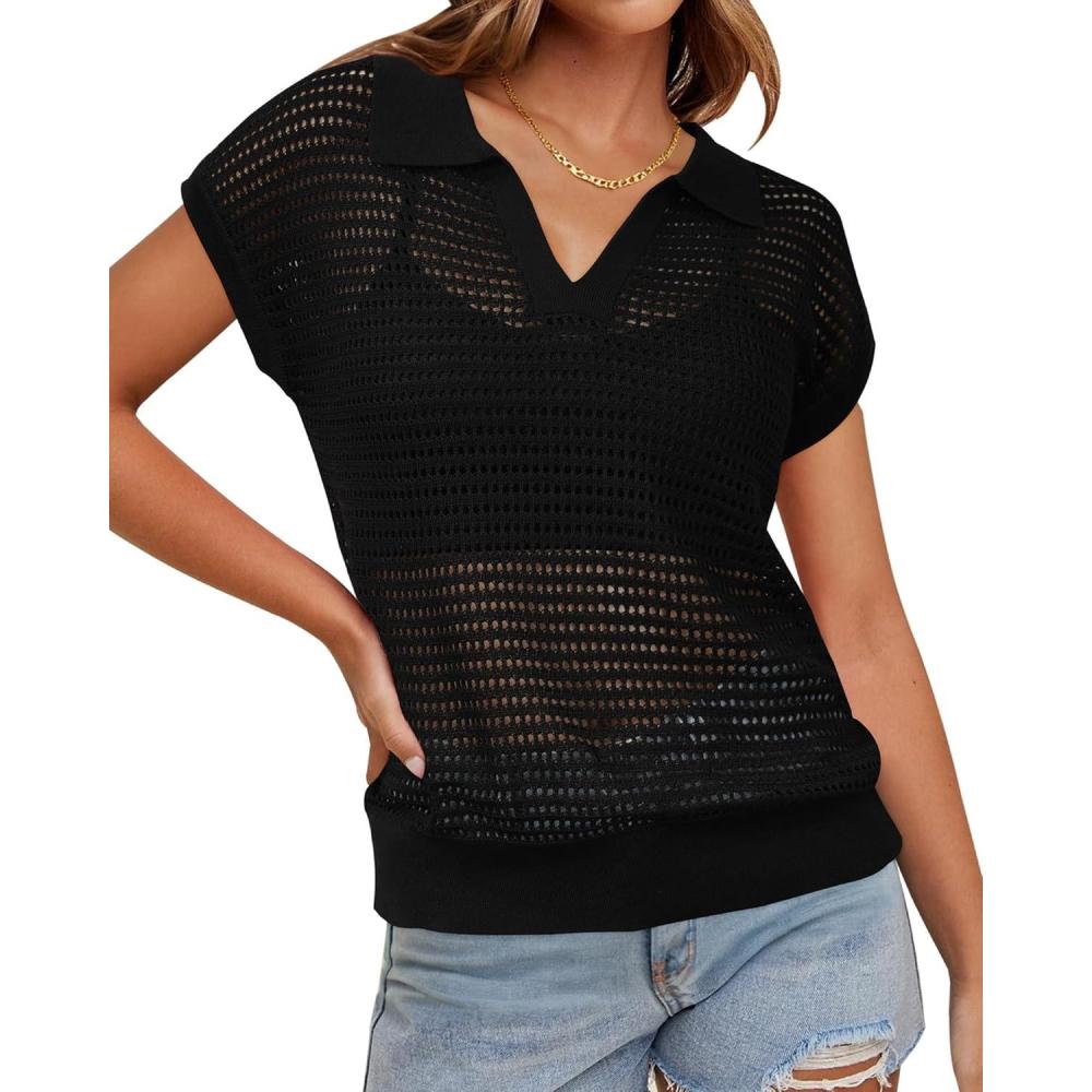 Arach&Cloz 2025 Women's Crochet Cap Sleeve Knit Tops Spring Summer Shirts Lightweight Collared Hollow Out Casual Blouses(Black)
