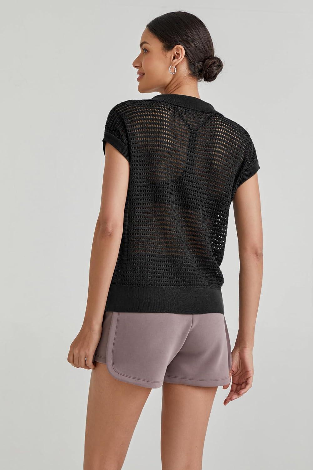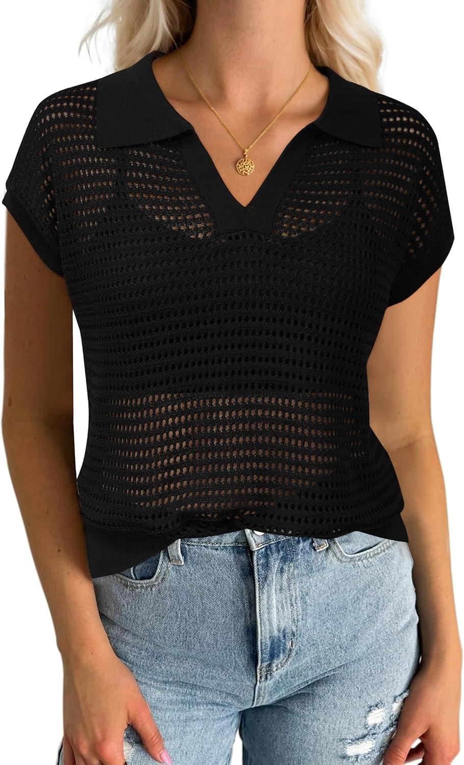 Arach&Cloz 2025 Women’s Crochet Cap Sleeve Knit Tops Spring Summer Shirts Lightweight Collared Hollow Out Casual Blouses(Black)