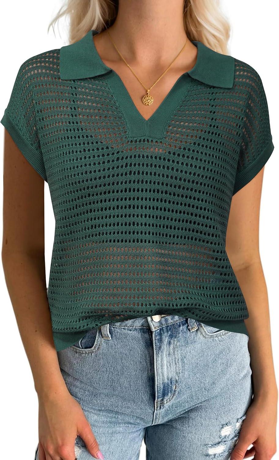 Arach&Cloz 2025 Women’s Crochet Cap Sleeve Knit Tops Spring Summer Shirts Lightweight Collared Hollow Out Casual Blouses(Green)