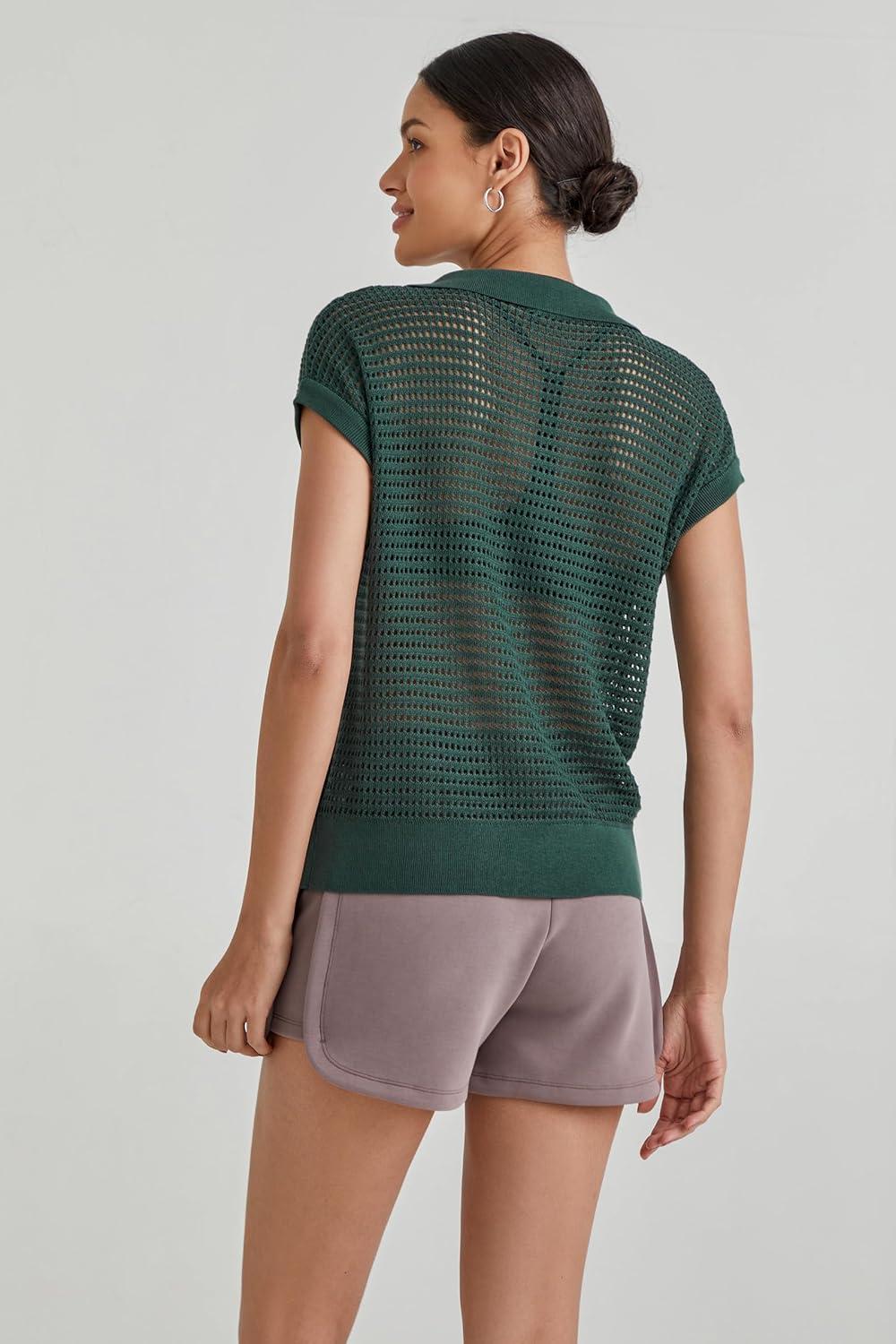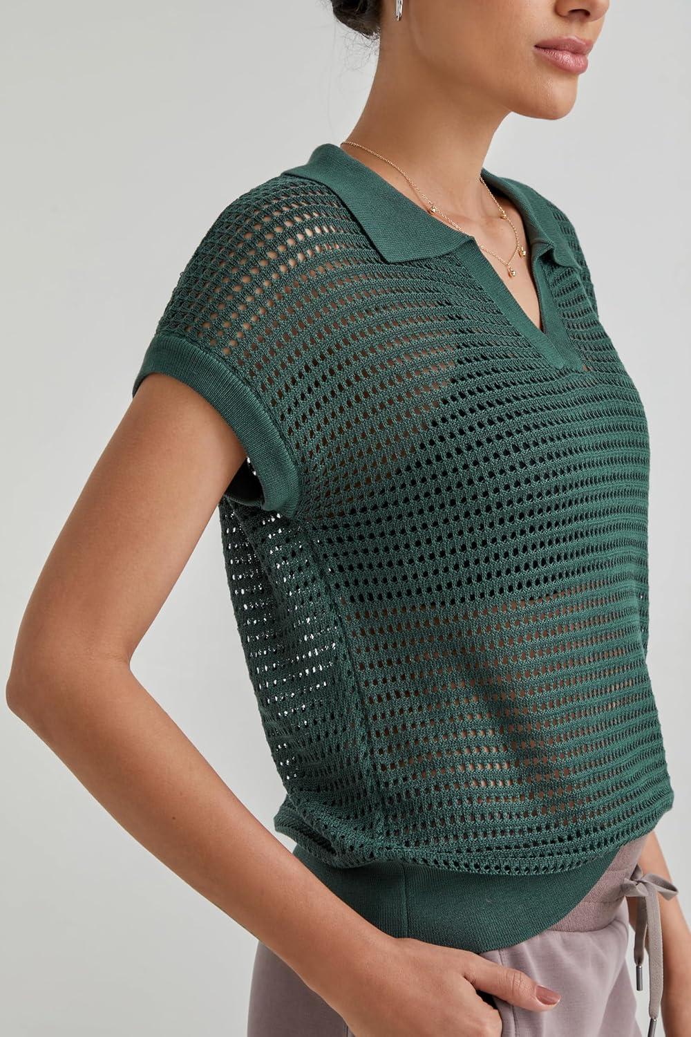 Arach&Cloz 2025 Women's Crochet Cap Sleeve Knit Tops Spring Summer Shirts Lightweight Collared Hollow Out Casual Blouses(Green)