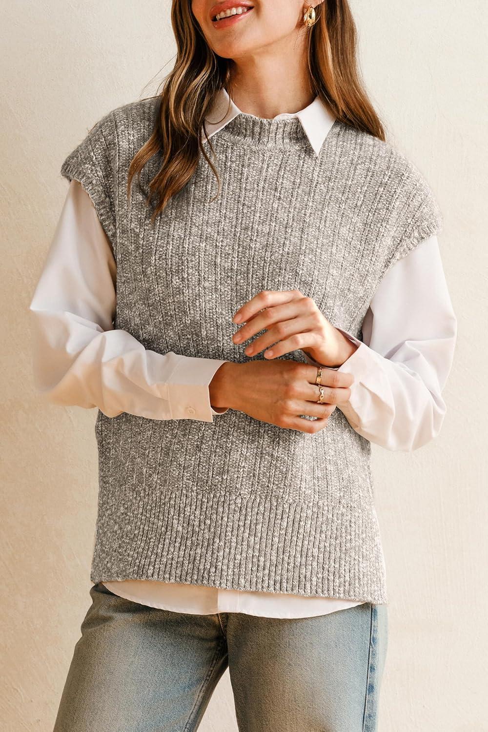 Arach&Cloz Women’s Cotton Blend Cap Sleeve Side Slit Sweater Vest Fall Casual Tops 2025(Khaki Grey)