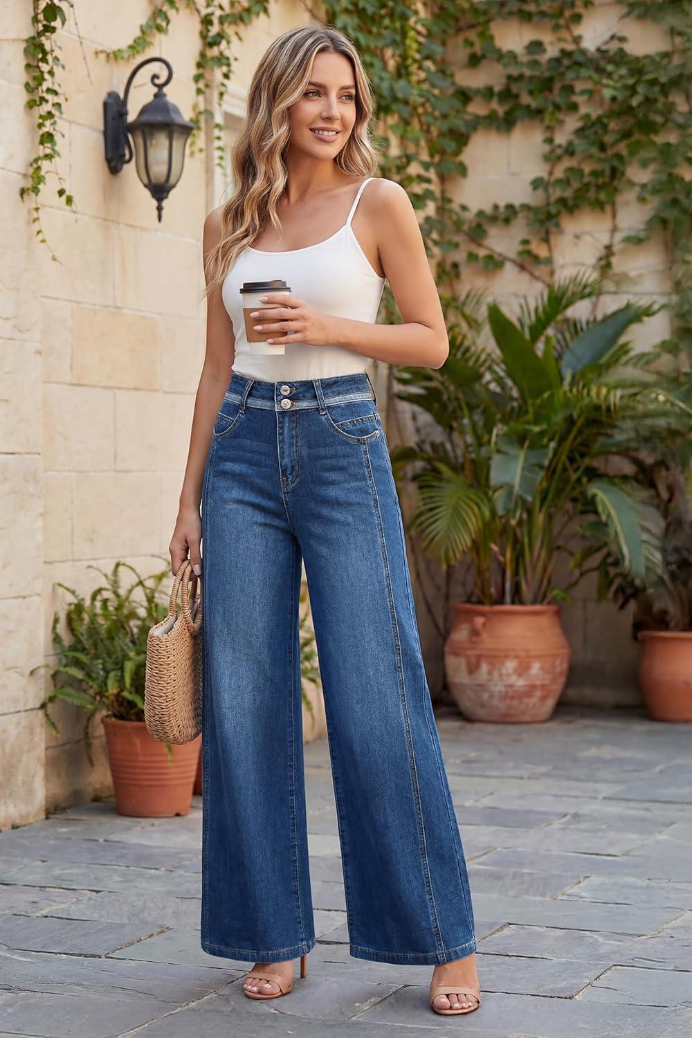 Arach&Cloz Women’s Cotton Contrast Waistband Wide Leg Stretchy Denim Jeans 2026(Blue)