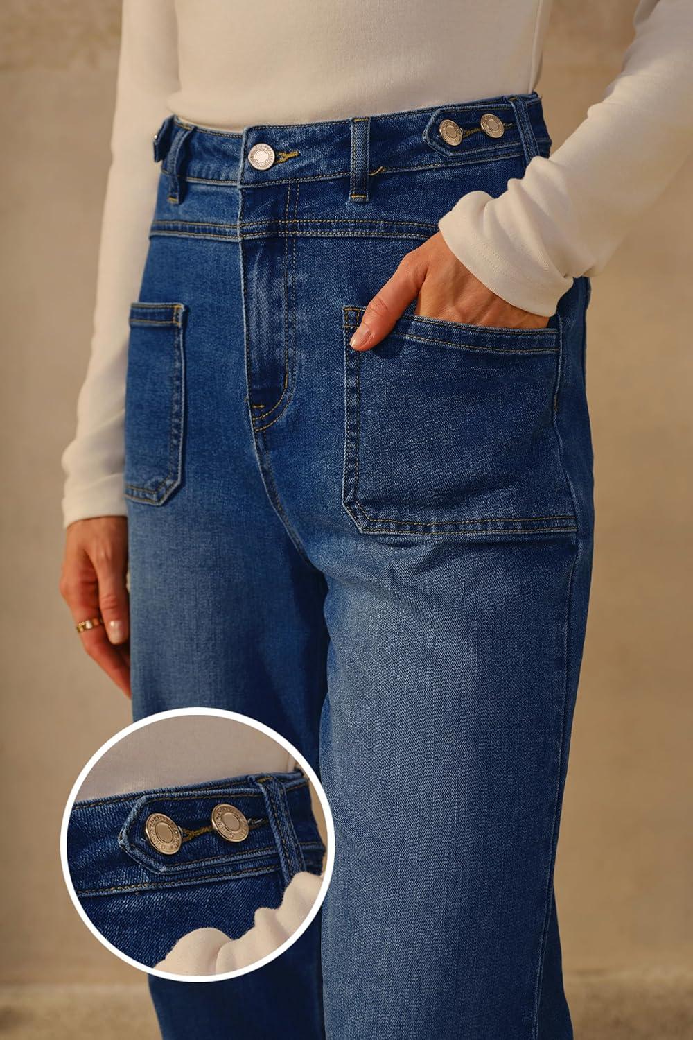 Arach&Cloz Women’s Denim Adjustable Waist Buttons High Waisted Wide Leg Jeans 2025(Dark Blue)