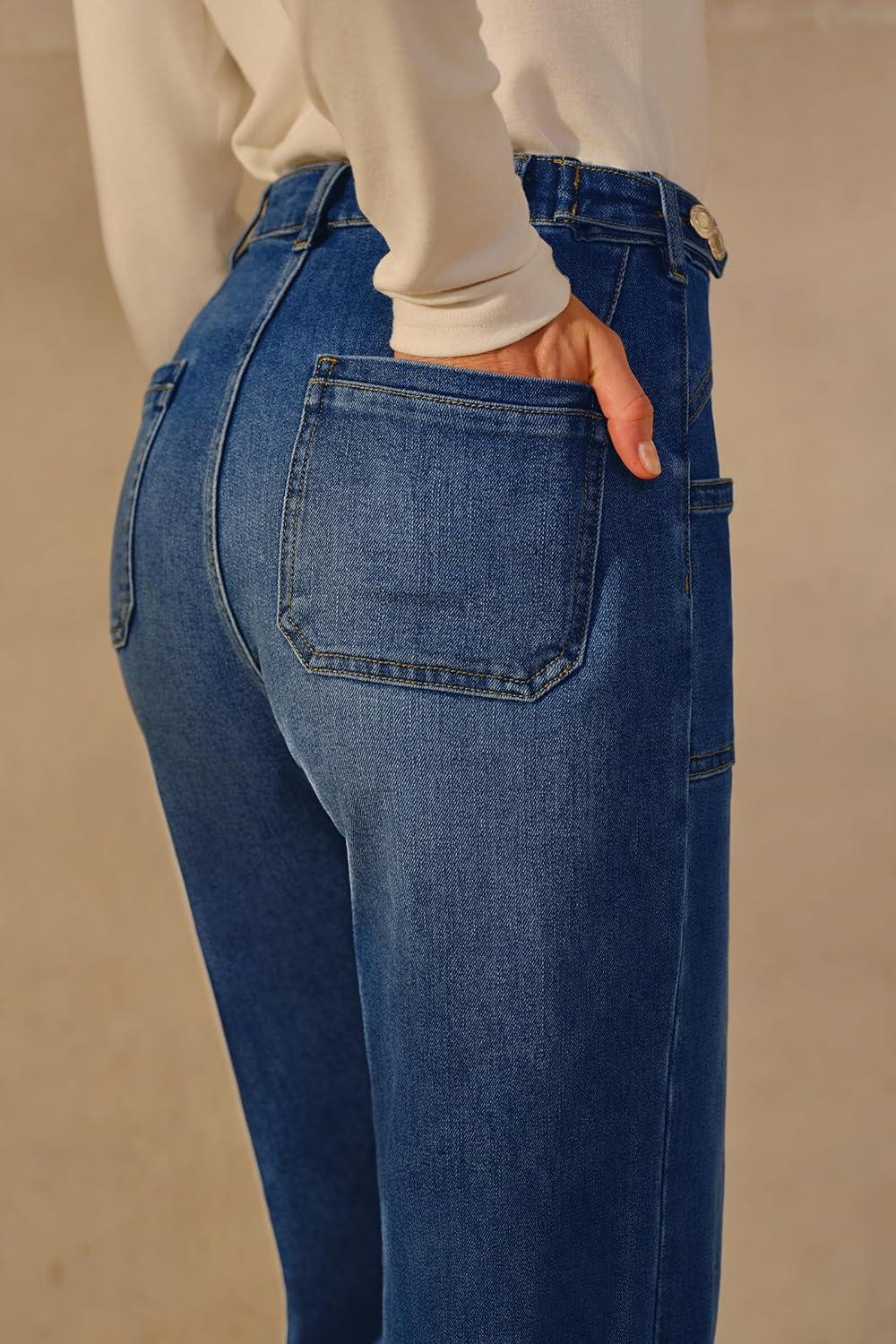 Arach&Cloz Women’s Denim Adjustable Waist Buttons High Waisted Wide Leg Jeans 2025(Blue)