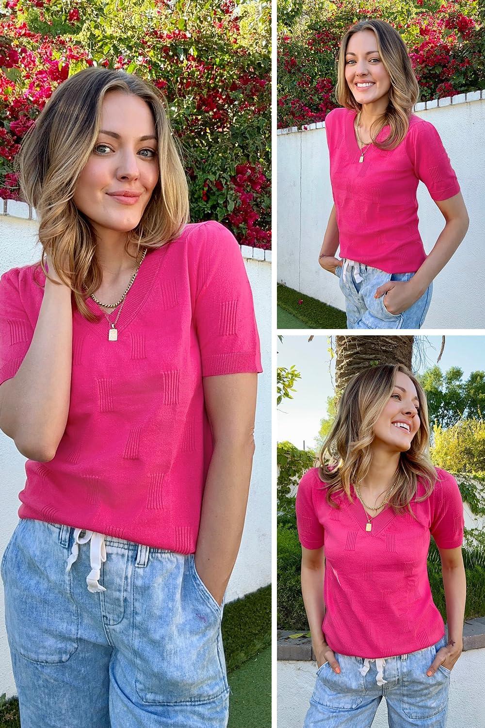 Arach&Cloz Women’s Lightweight Fall Sweater Tops Casual Short Sleeve Blouses Shirts(Hot Pink)