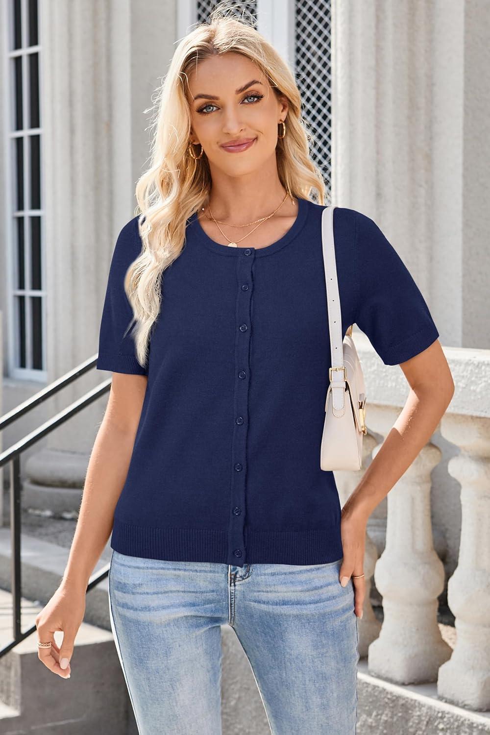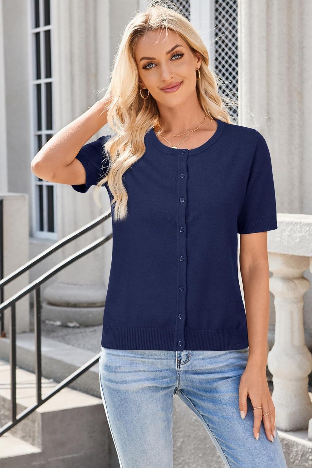 Arach&Cloz Women’s Lightweight Short Sleeve Business Casual Cropped Cardigan Tops(Light Navy)