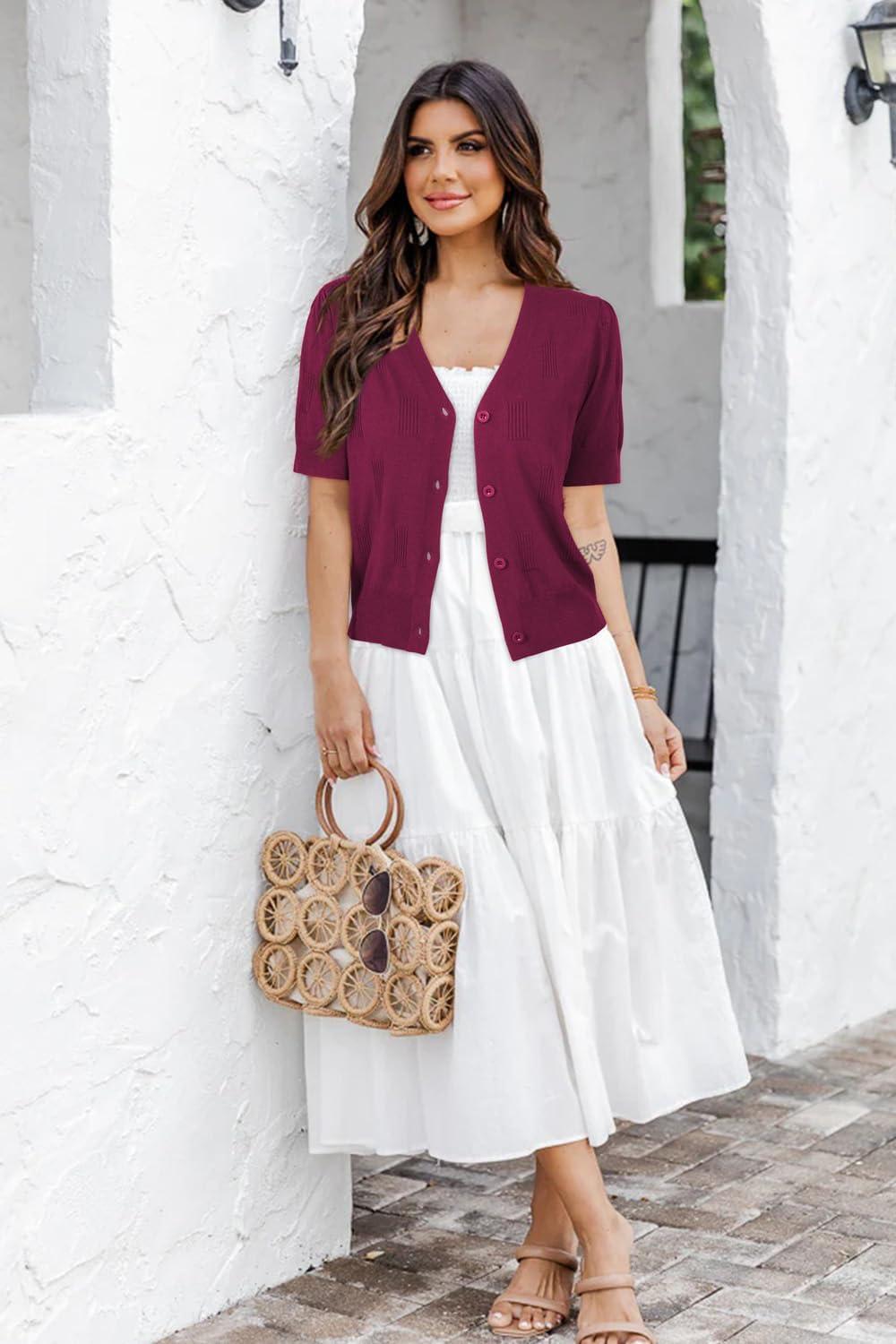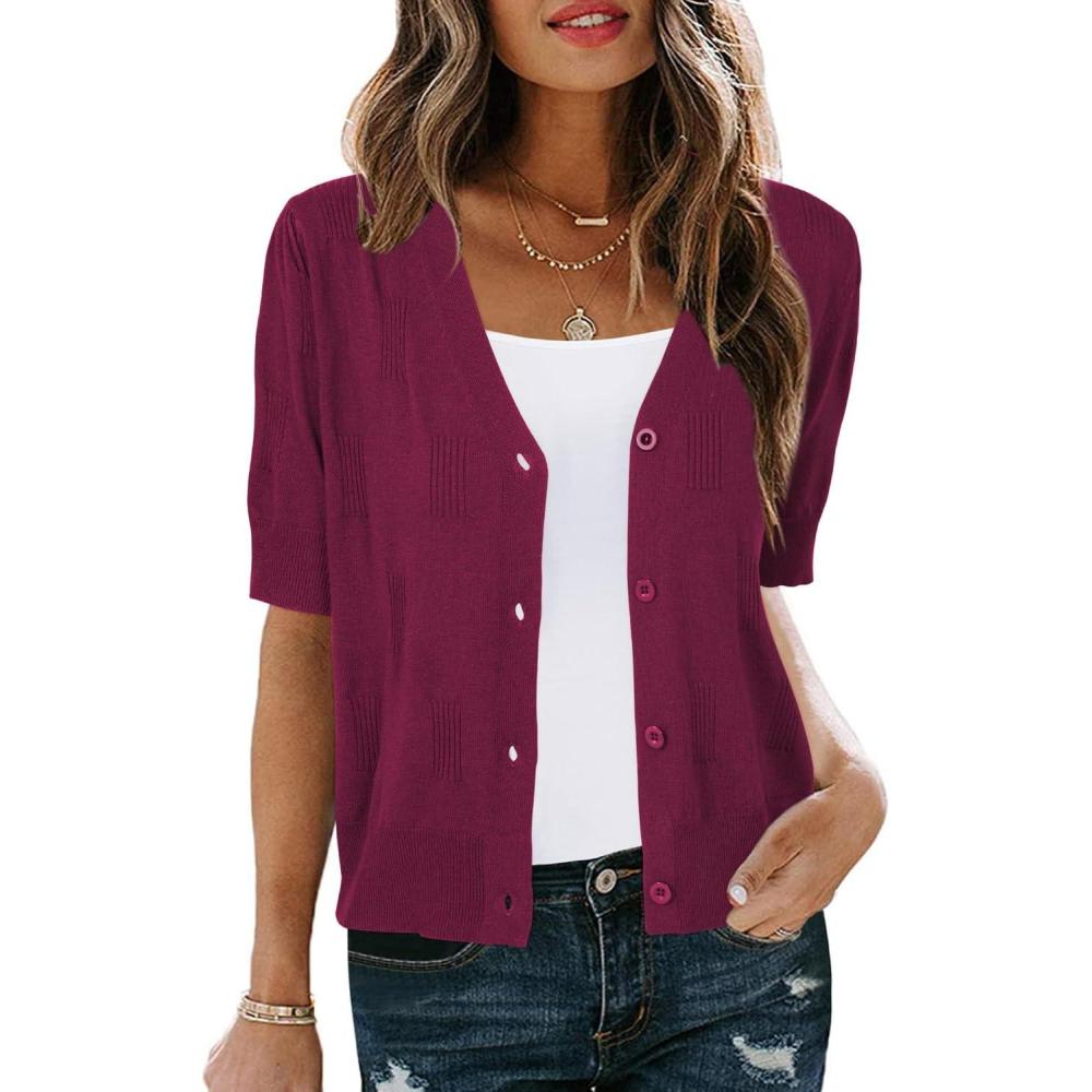 Arach&Cloz Women’s Lightweight Summer Business Casual Cropped Short Sleeve Cardigan(Wine Red)