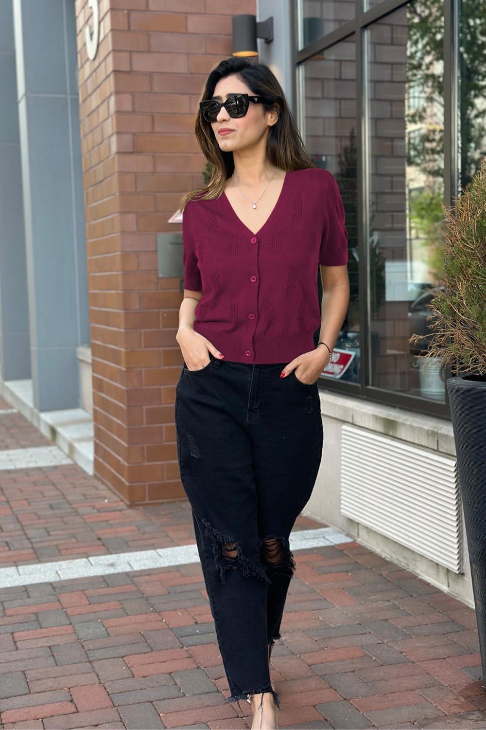 Arach&Cloz Women's Lightweight Summer Business Casual Cropped Short Sleeve Cardigan(Wine Red)