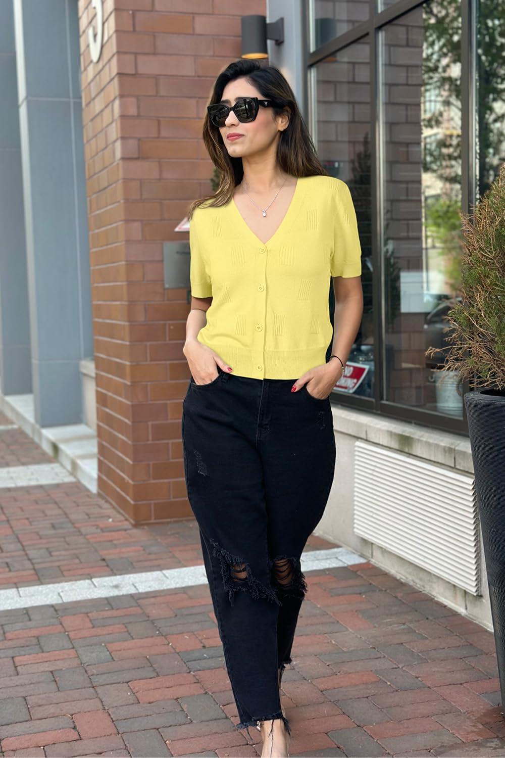 Arach&Cloz Women’s Lightweight Summer Business Casual Cropped Short Sleeve Cardigan(Yellow)