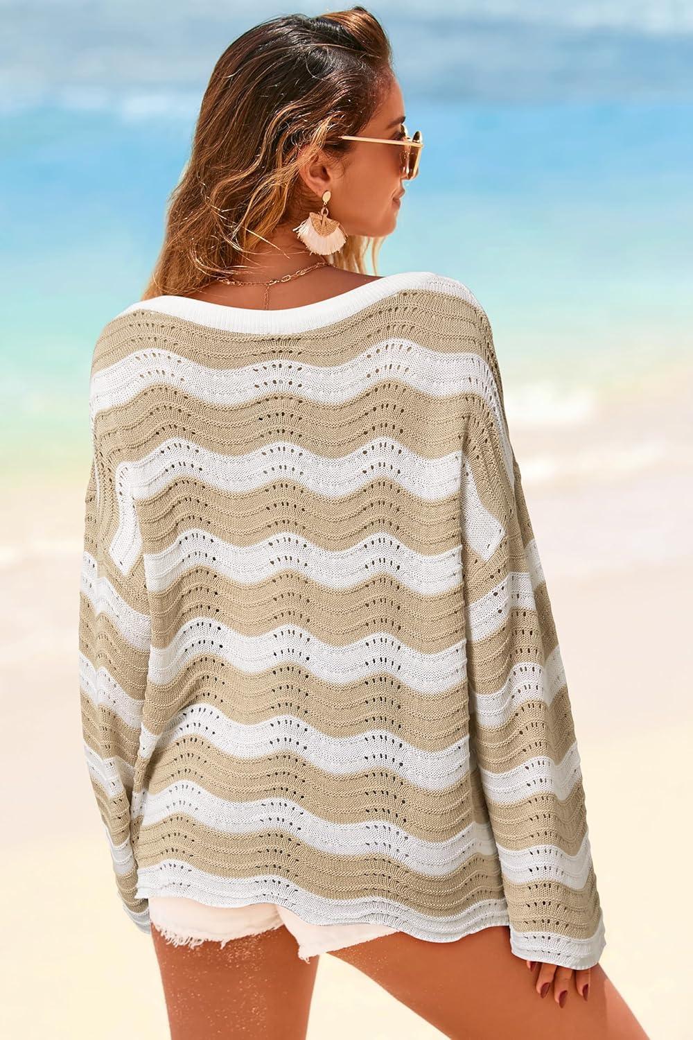 Arach&Cloz Women’s Linen Blend Crochet Bell Sleeve Beach Vacation Striped Tops 2026(Apricot Stripe)