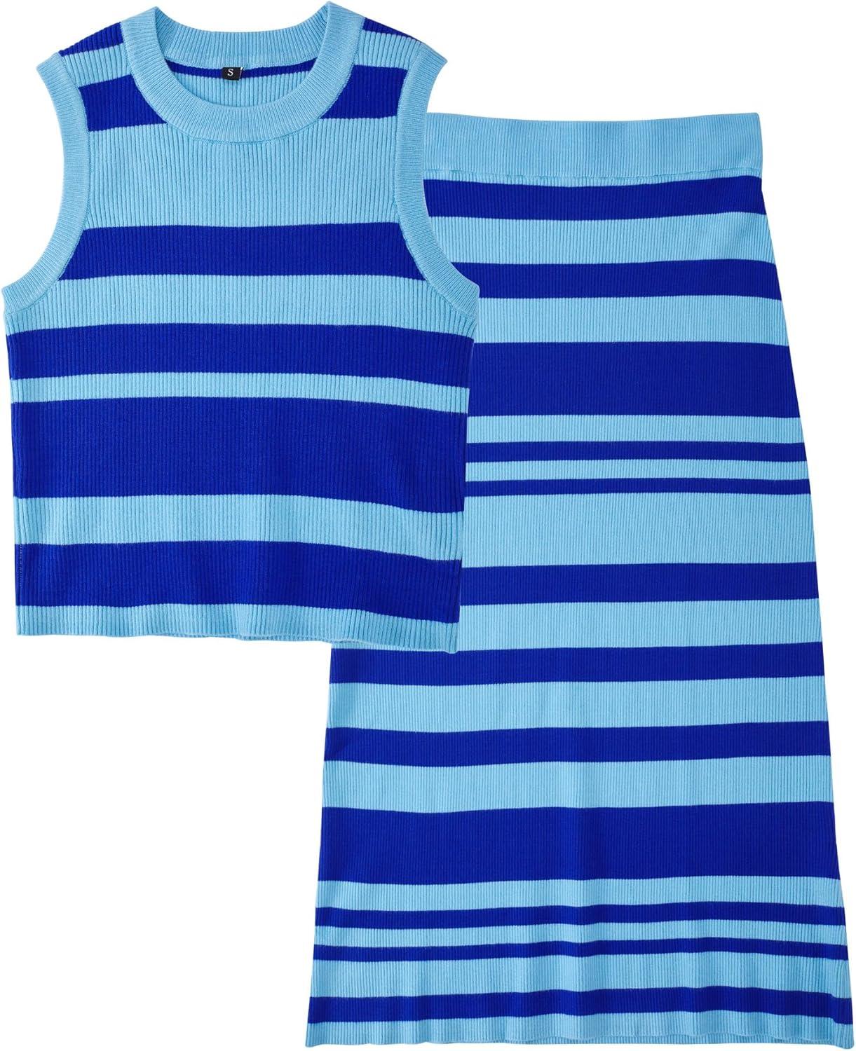 Arach&Cloz Women’s Non See Through 2 Piece Sets Early Fall Tank Top and Midi Skirt Knit Outfits(Blue)