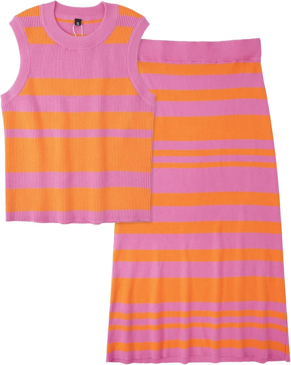 Arach&Cloz Women's Non See Through 2 Piece Sets Early Fall Tank Top and Midi Skirt Knit Outfits(Dark Orange Pink)