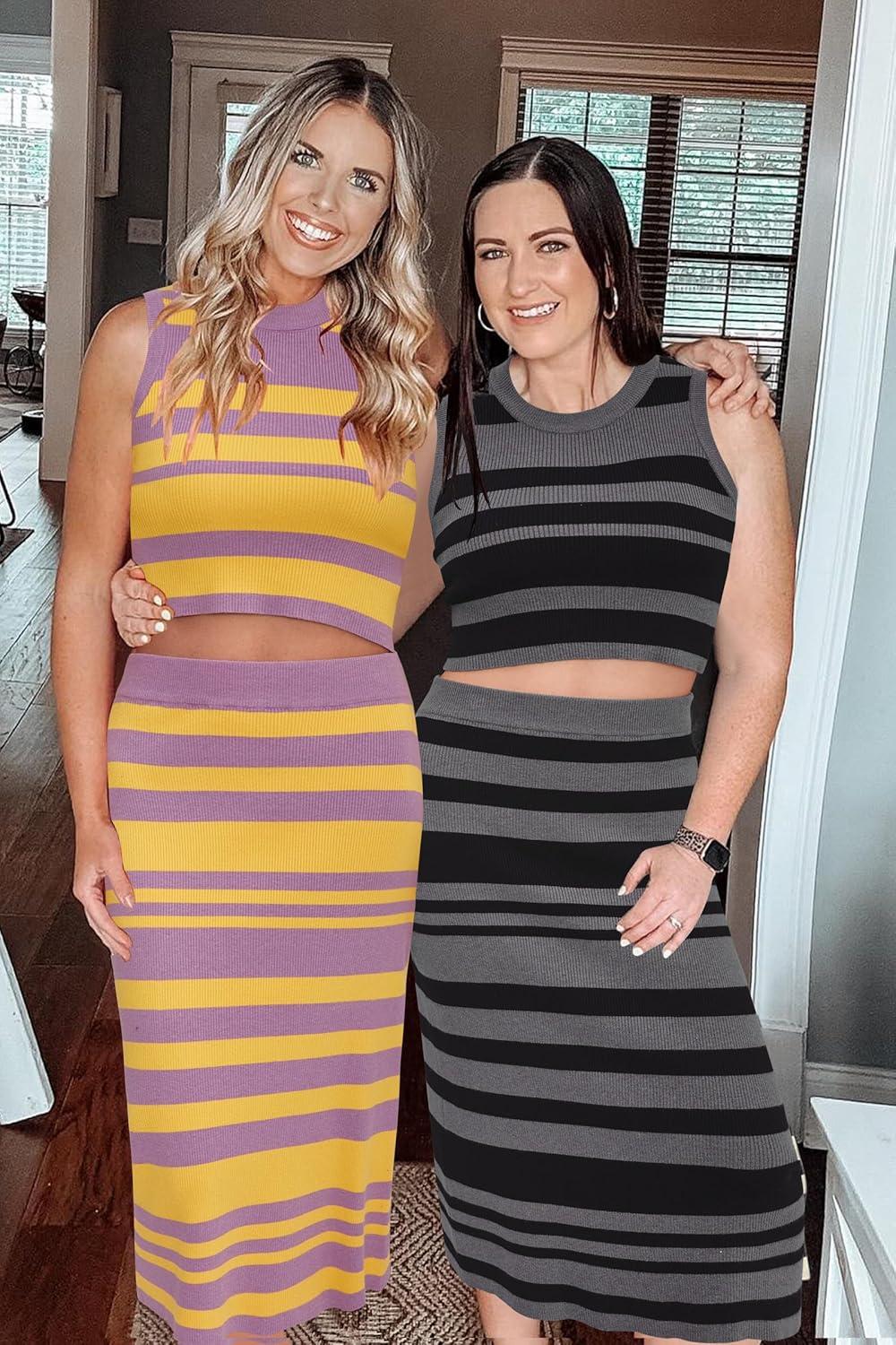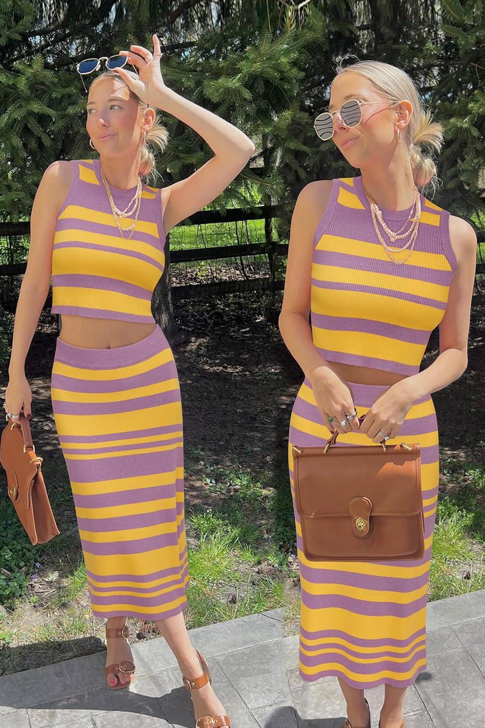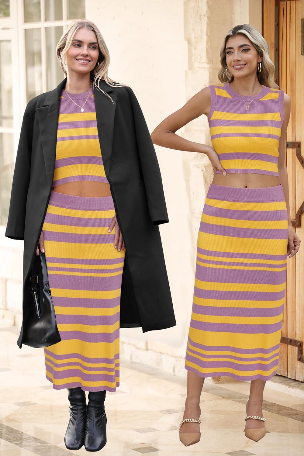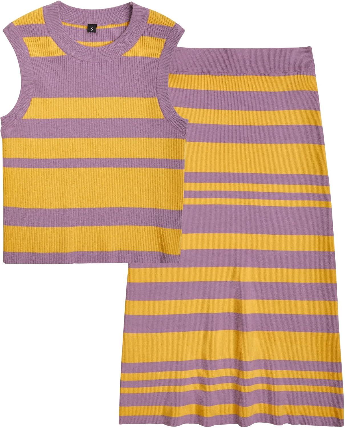 Arach&Cloz Women’s Non See Through 2 Piece Sets Early Fall Tank Top and Midi Skirt Knit Outfits(Purple-yellow)