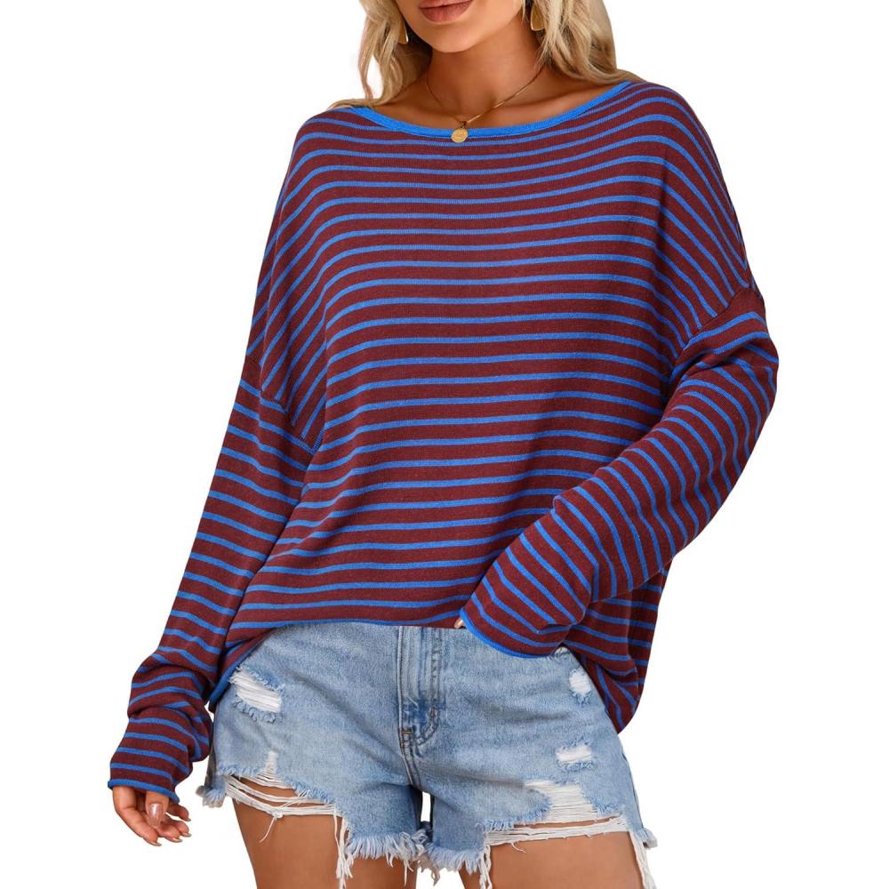 Arach&Cloz Women’s Oversized Linen Blend Beach Vacation Cover Up Summer Casual Off Shoulder Tops 2026(Blue Stripe)