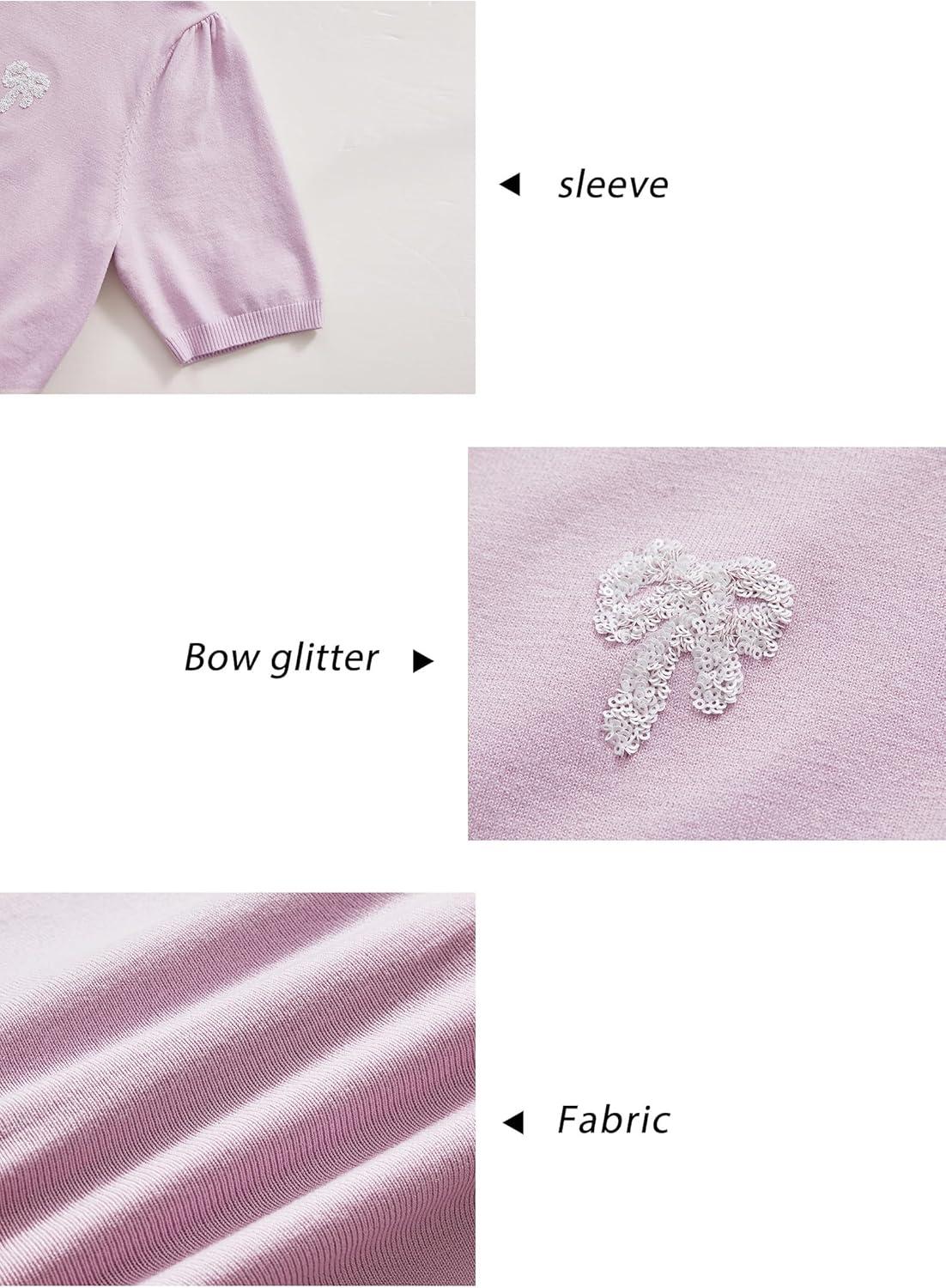 Arach&Cloz Women's Puff Short Sleeve Shirts 2025 Summer Crew Neck Sequin Cute Crop Tops Trendy Casual Pullover(Light Pink)