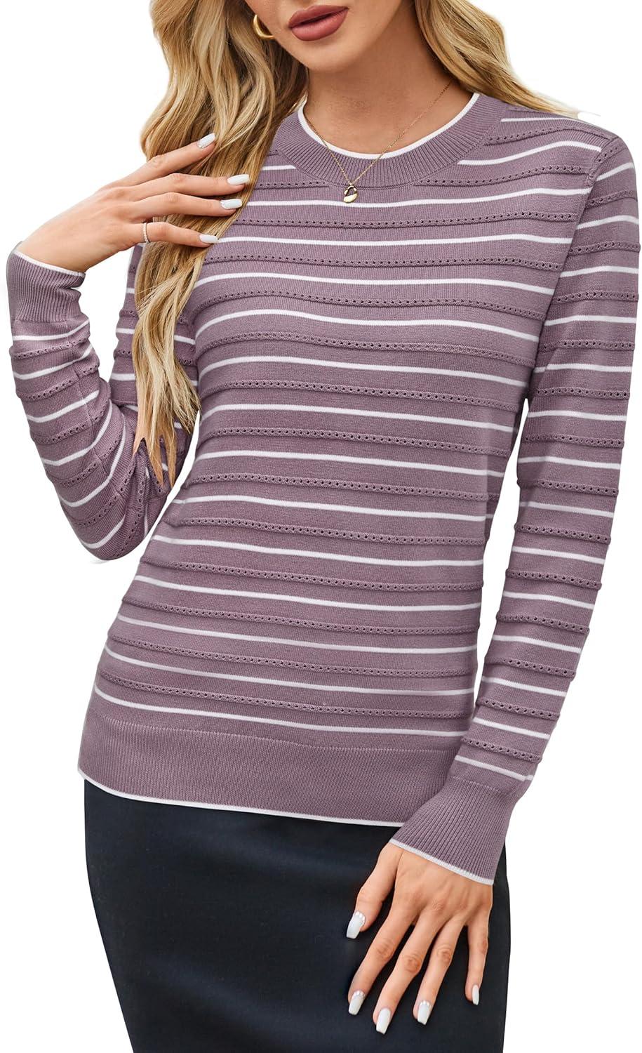 Arach&Cloz Women’s Soft Knit Sweater Fall Dressy Casual Pullover Tops(Striped Purple White)