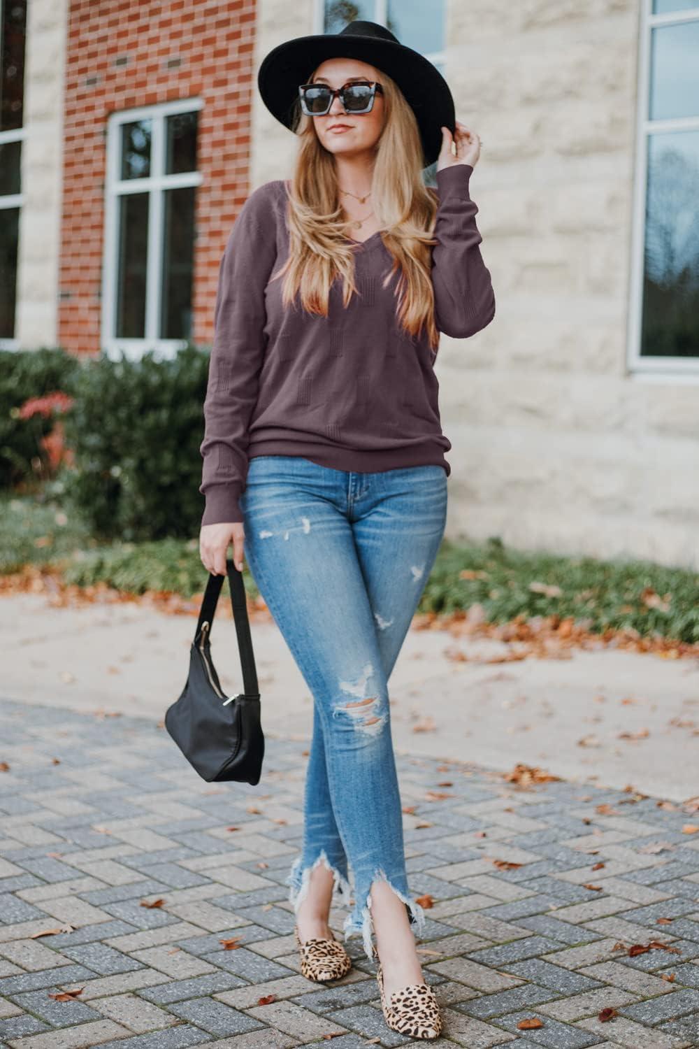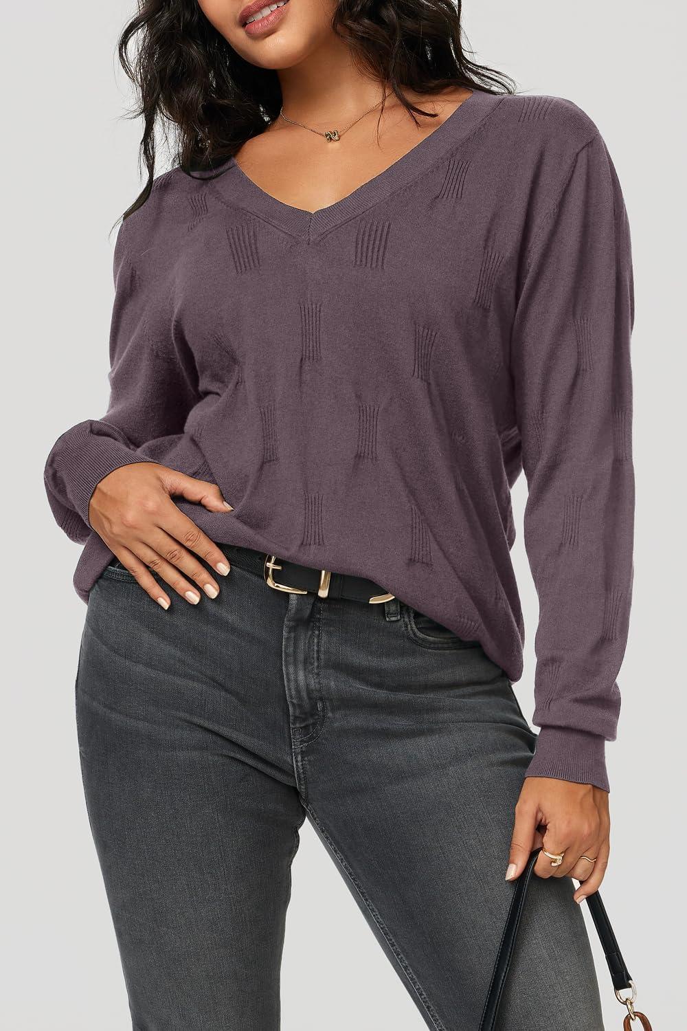 Arach&Cloz Women’s Soft V Neck Long Sleeve Fall Casual Regular Fit Sweater Tops(Grey Purple)