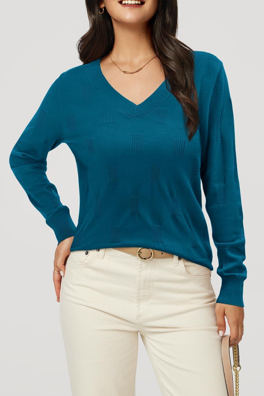 Arach&Cloz Women's Soft V Neck Long Sleeve Fall Casual Regular Fit Sweater Tops(Peacock Blue)