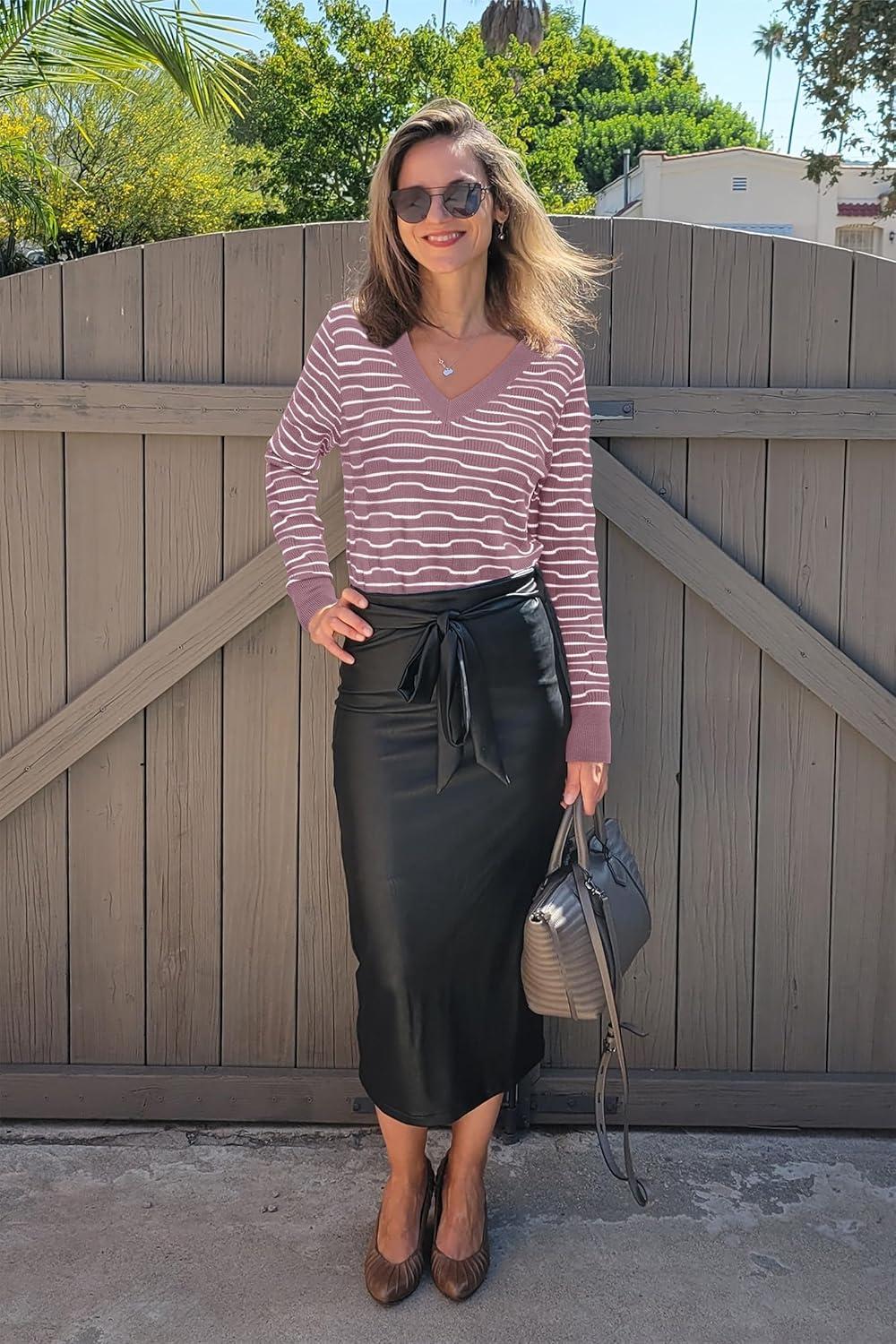 Arach&Cloz Women’s Soft V Neck Long Sleeve Fall Casual Regular Fit Sweater Tops(Striped White Black)