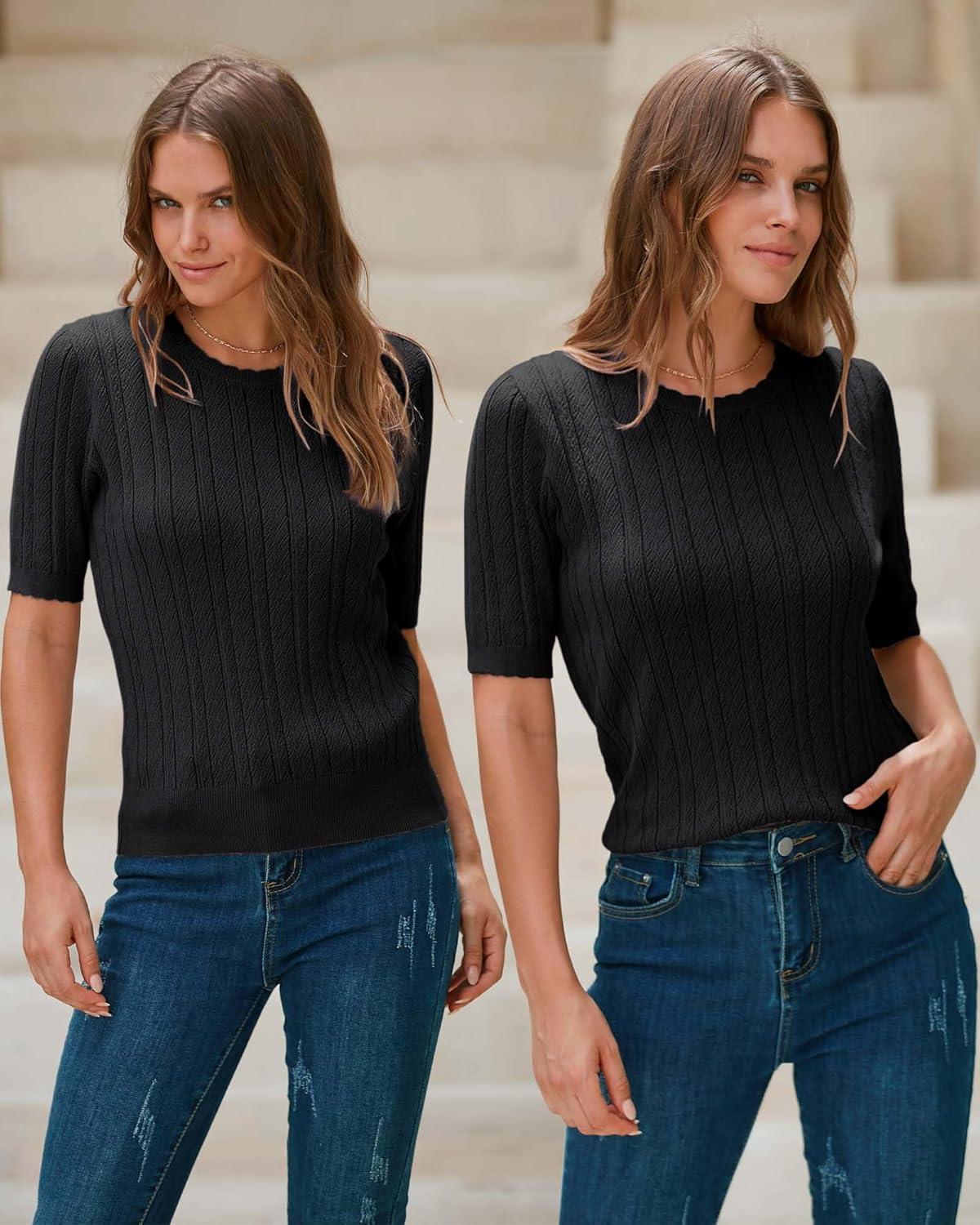 Arach&Cloz Women’s Spring Summer Scalloped Short Sleeve Tops Textured Shirts(Black)