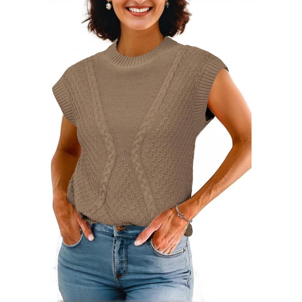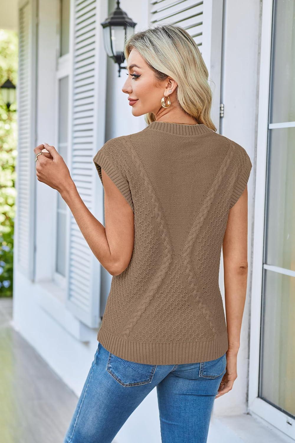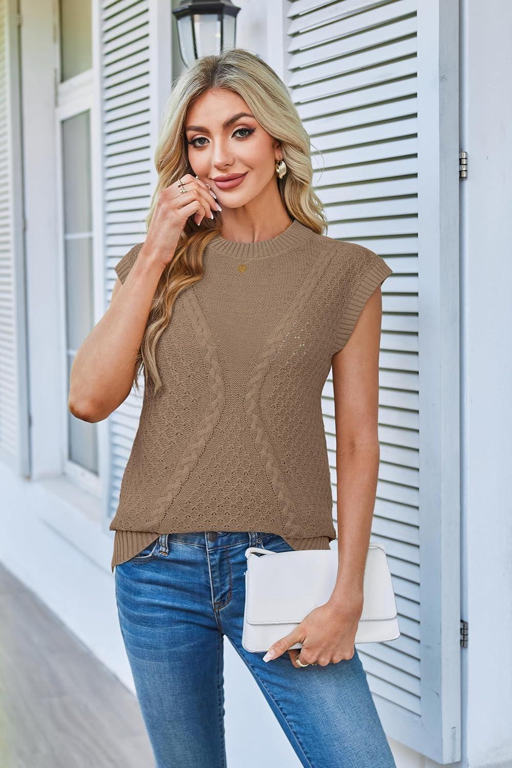 Arach&Cloz Womens Spring Sweater Vest 2025 Cap Sleeve Crew Neck Casual Tops Cable Knit Crochet Loose Fit Summer Outfits(Brown)