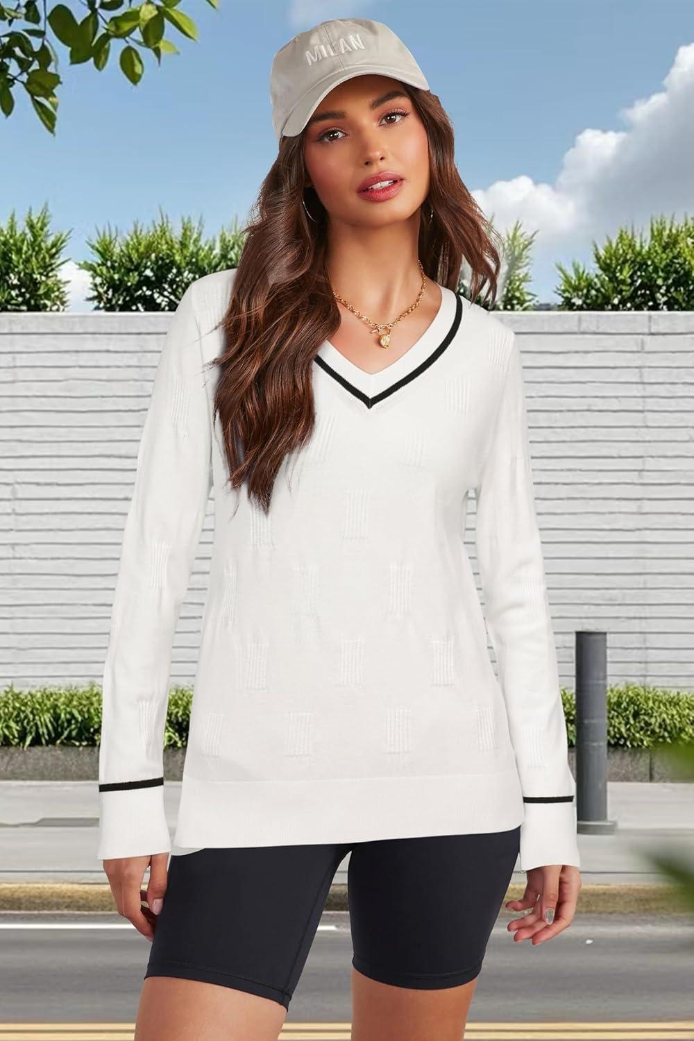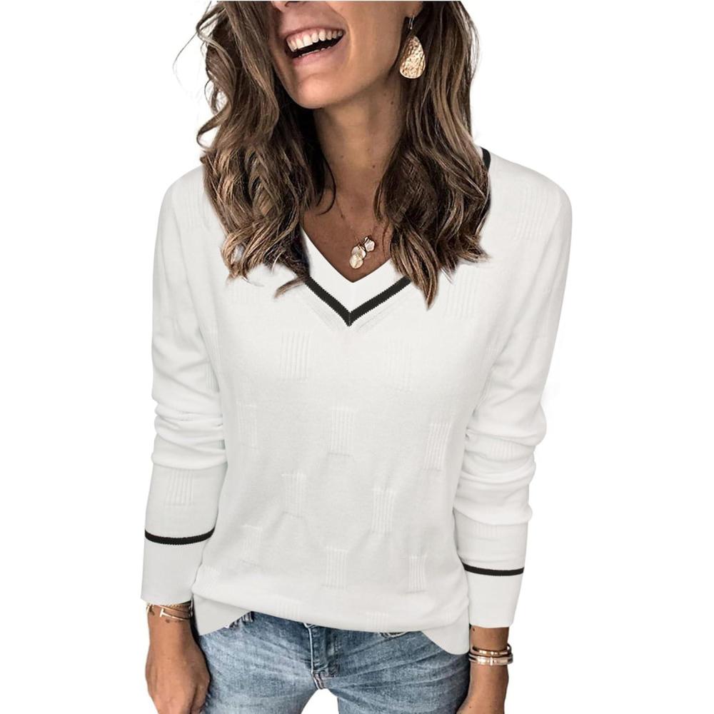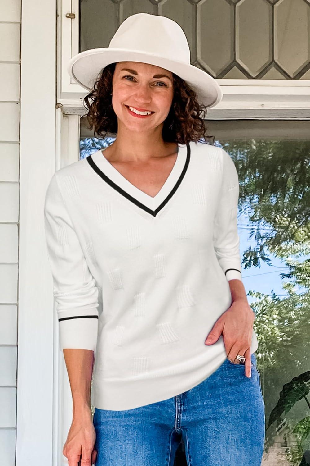 Arach&Cloz Women’s Spring Tops 2025 Fashion Trendy V Neck Long Sleeve Shirts Knitted Casual Pullover Sweater Clothes(White and Black)