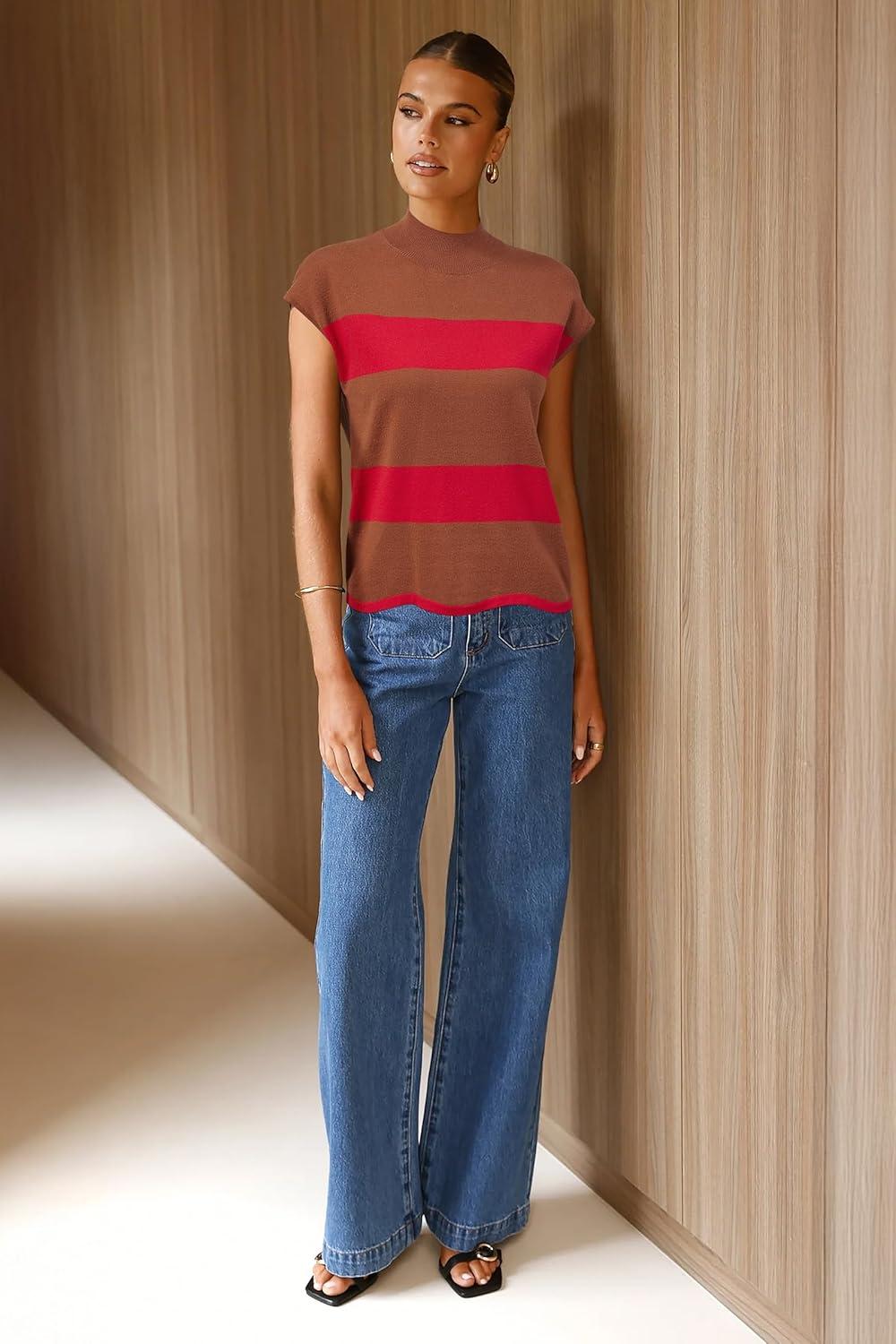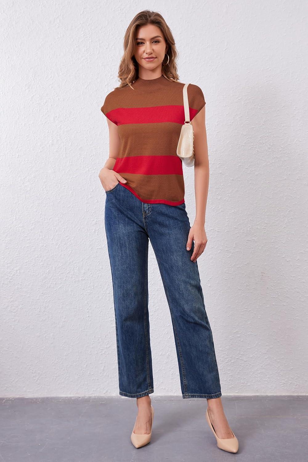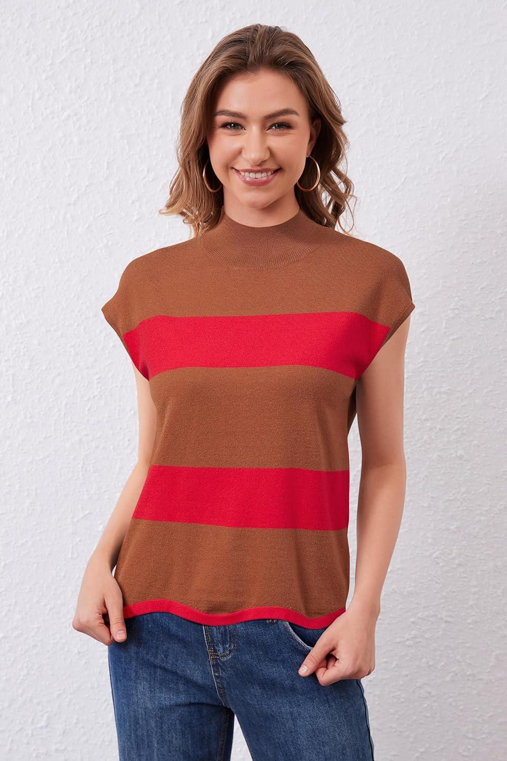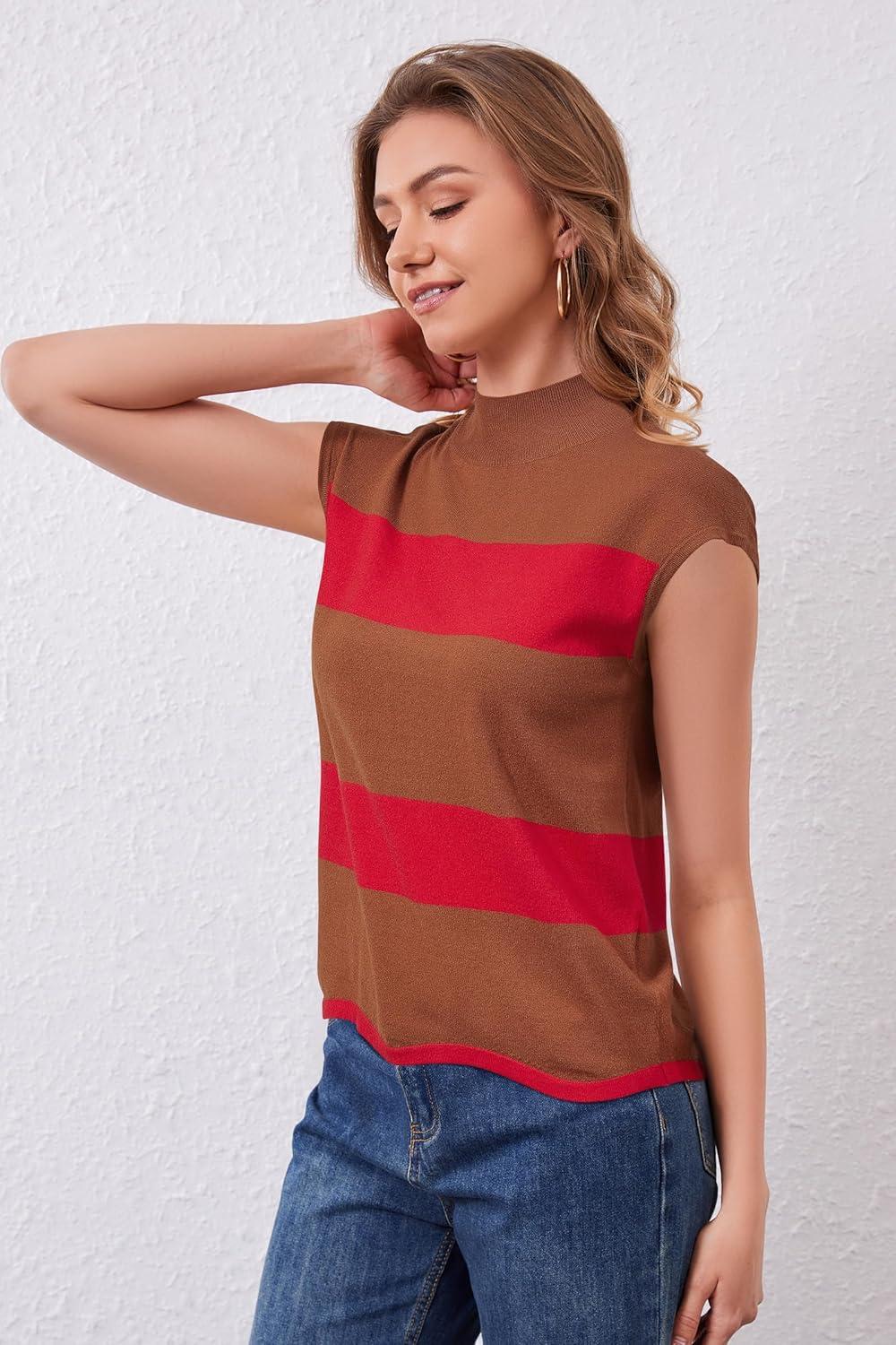 Arach&Cloz Women’s Striped Cap Sleeve Tops 2025 Spring Color Block Summer Lightweight Sweater Vest Mock Neck Shirts(Caramel-red)