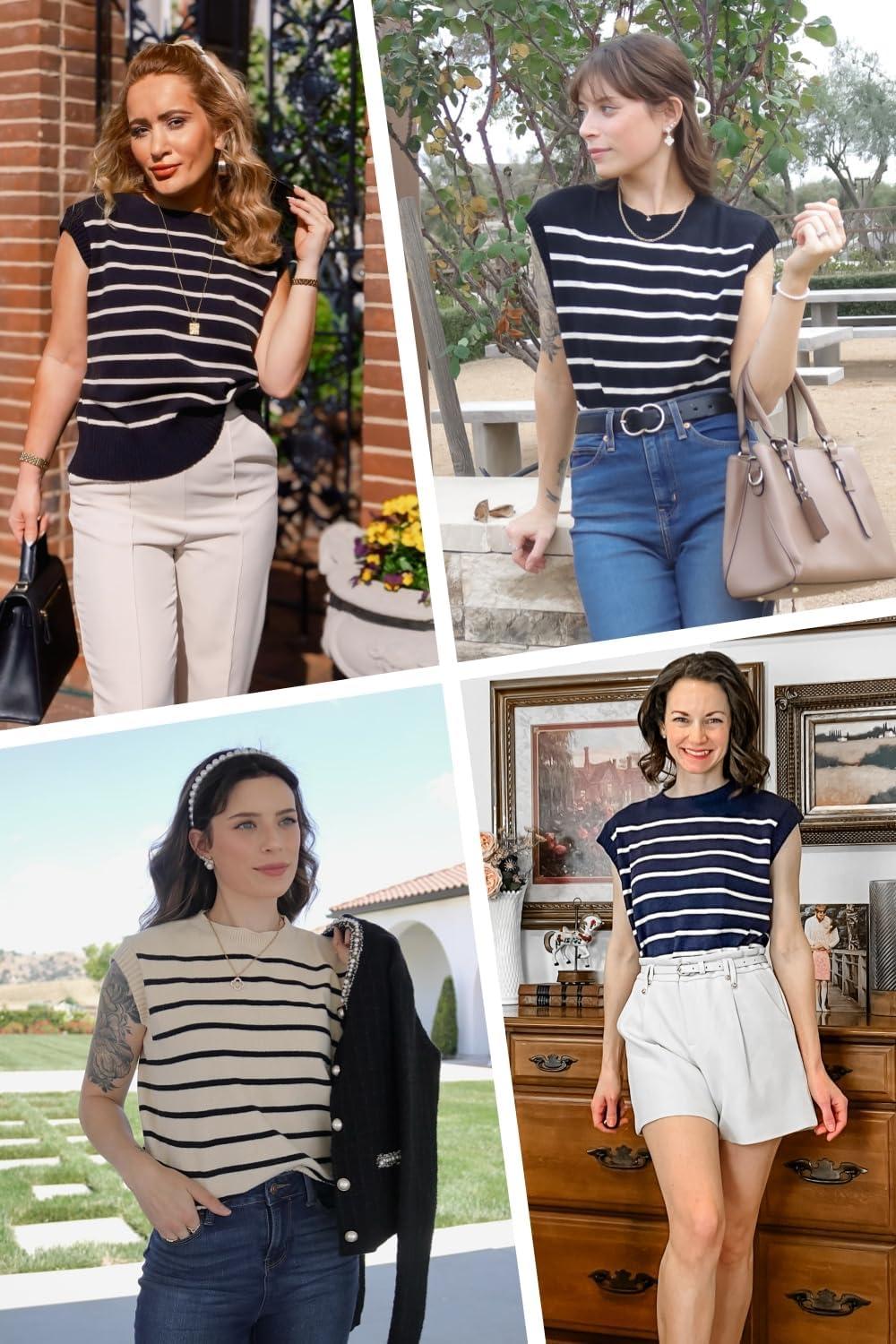 Arach&Cloz Womens Summer 2024 Sweater Vest Cap Sleeve Crew Neck Striped Fashion Casual Sleeveless Fall Tops Clothes(Khaki-white)