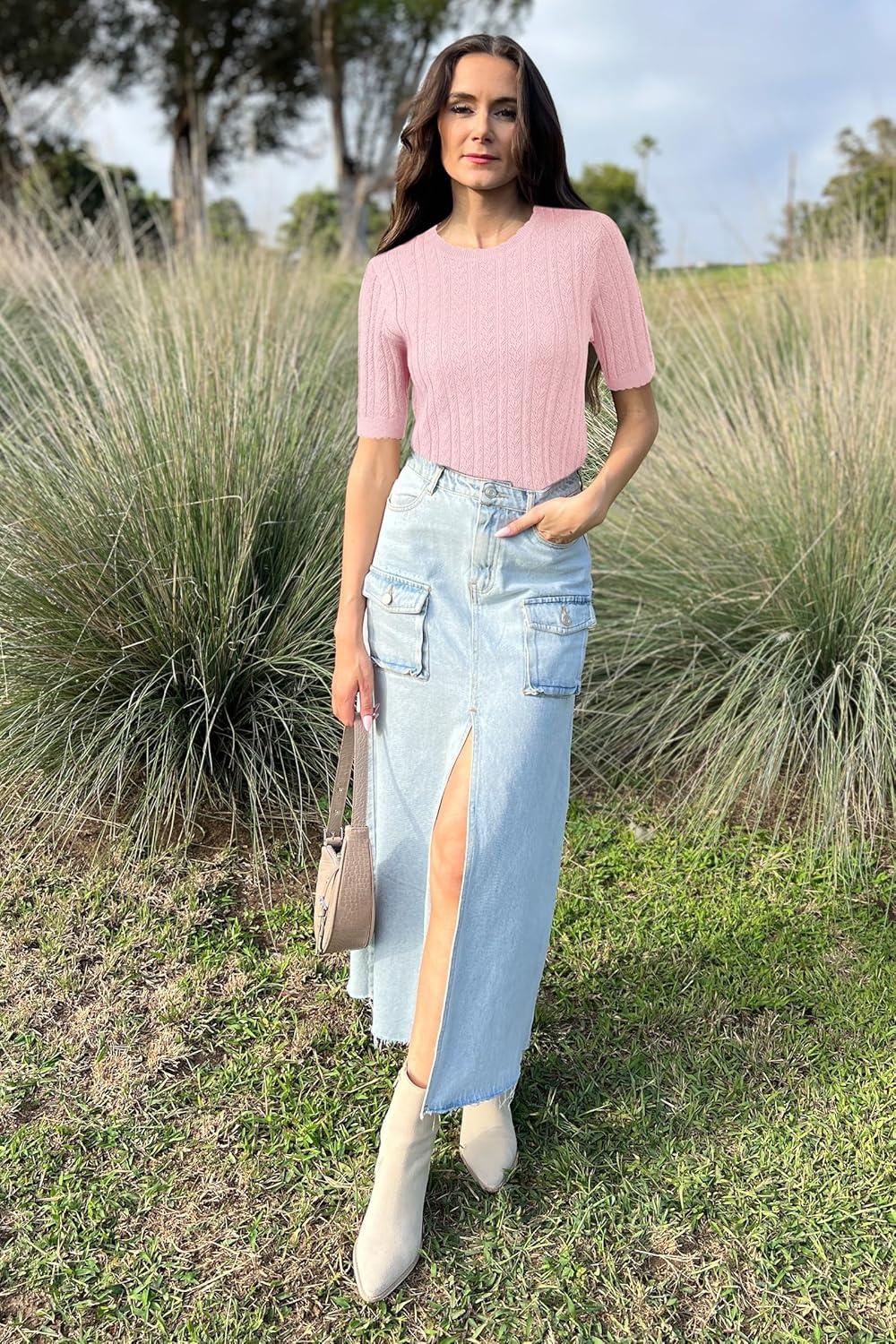 Arach&Cloz Women’s Summer Fall Scalloped Lace Cuff Crewneck Tops Textured Shirts(Pink 02)