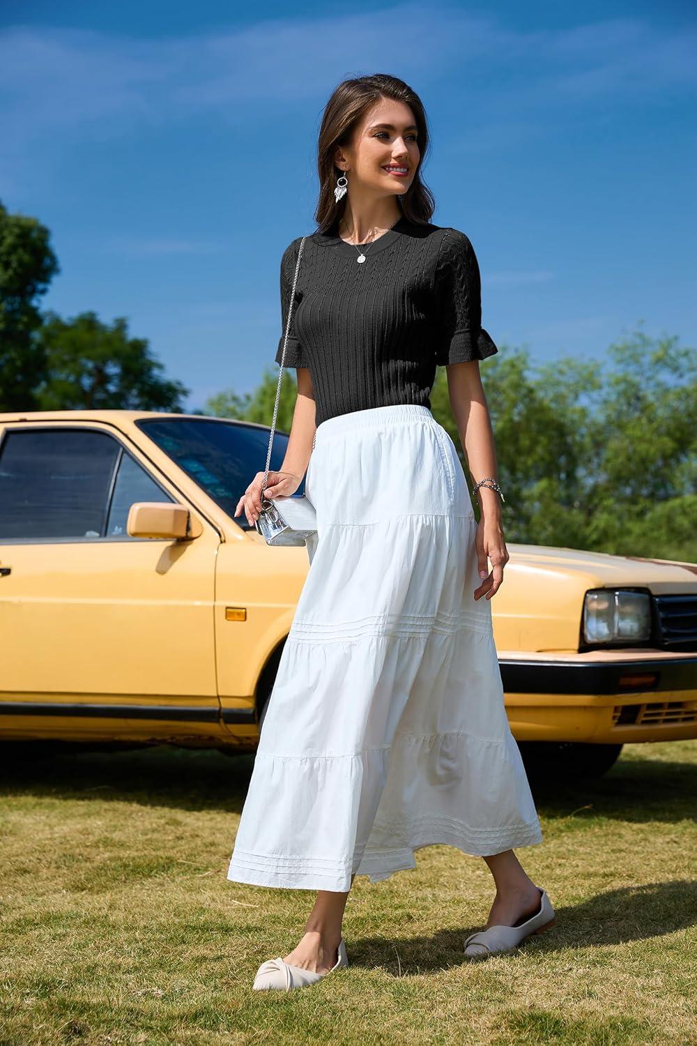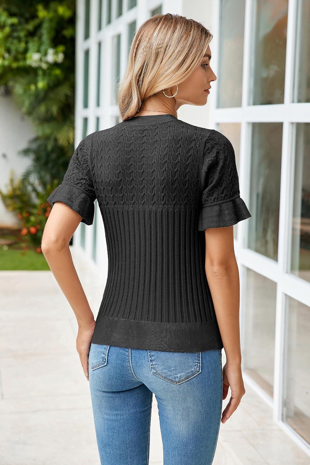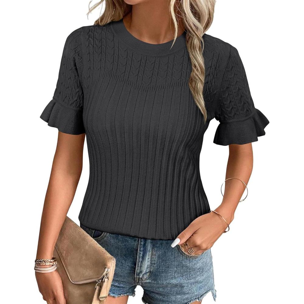 Arach&Cloz Women’s Summer Fall Scalloped Lace Cuff Crewneck Tops Textured Shirts(X-black)