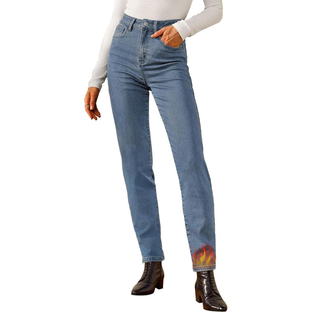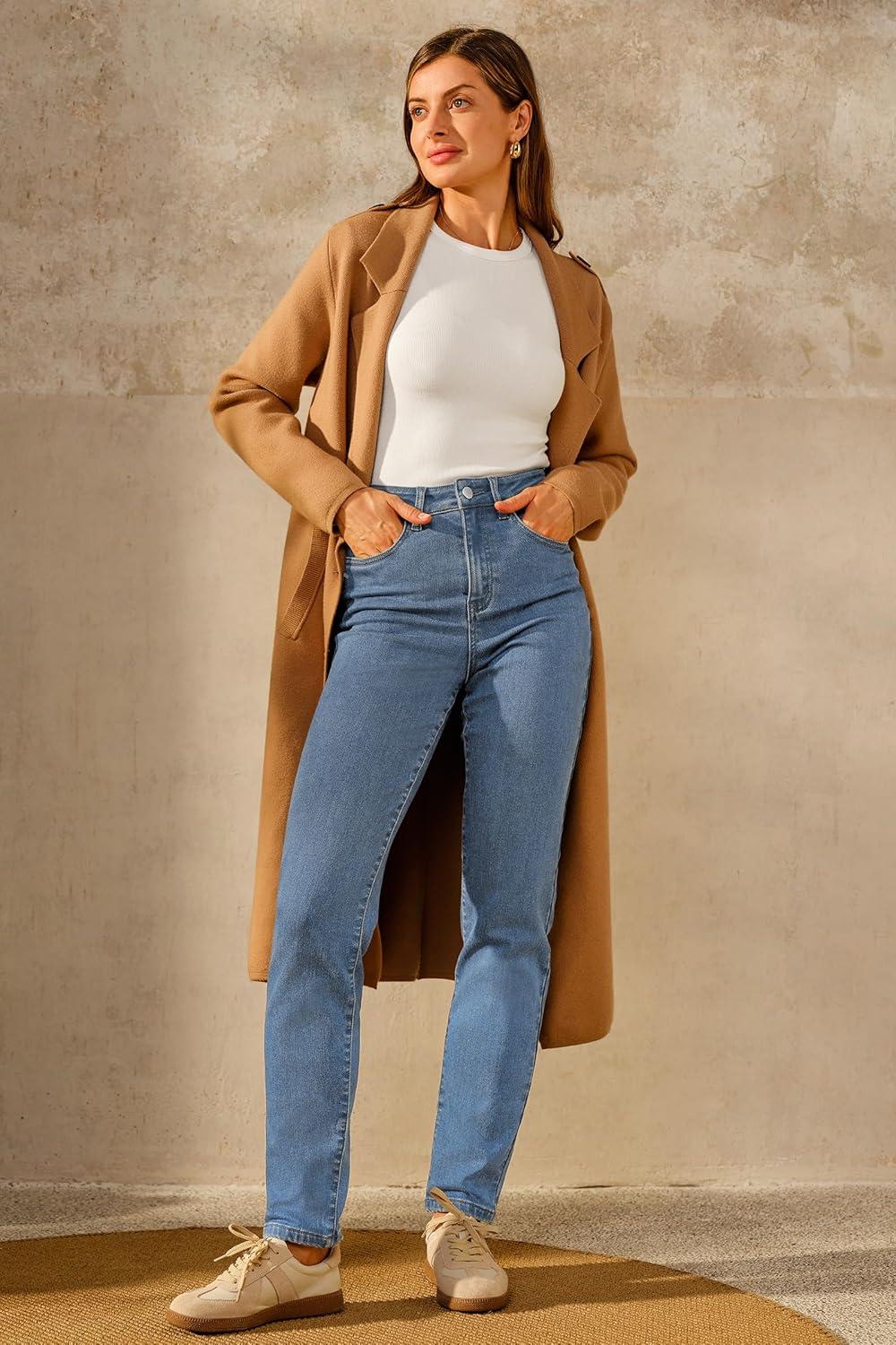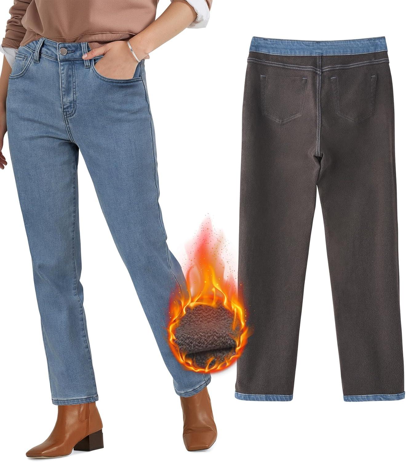 Arach&Cloz Women's Thin Fleece Lined Jeans High Waisted Stretch Warm Straight Leg Pants 2025(Light Blue)