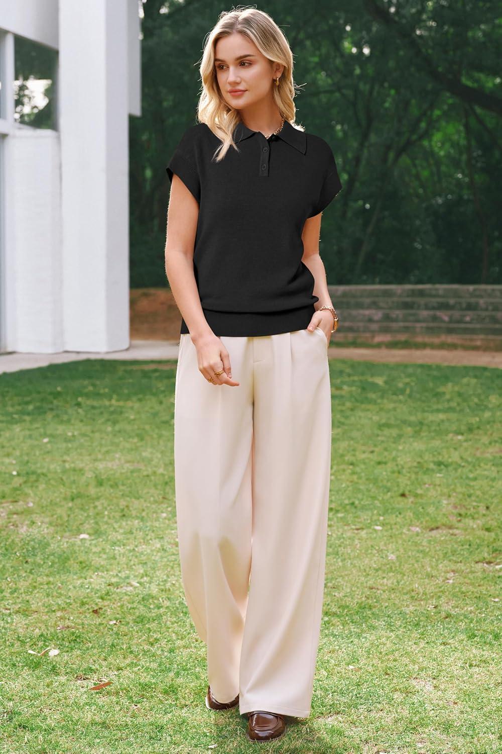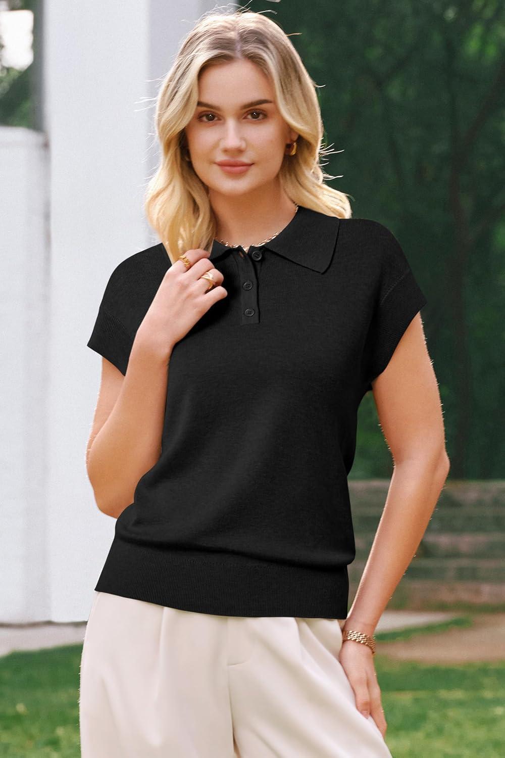 Arach&Cloz Women’s Wool Blend Cap Sleeves Business Casual Summer Tops Sweater Vest Polo Shirts 2026(Black)