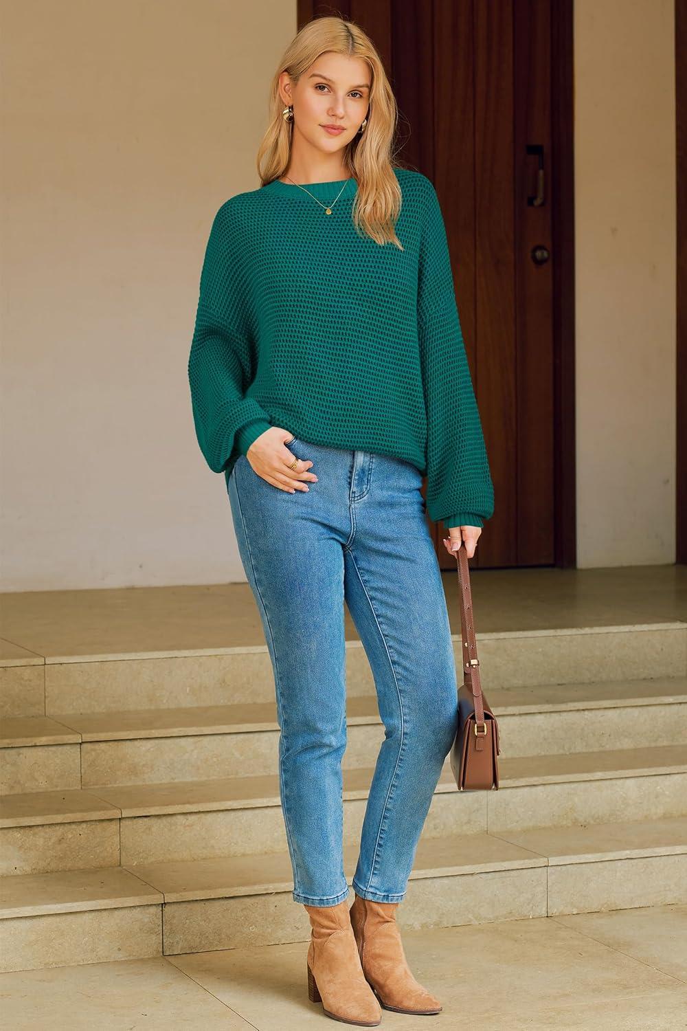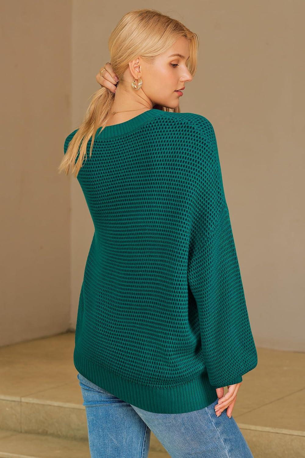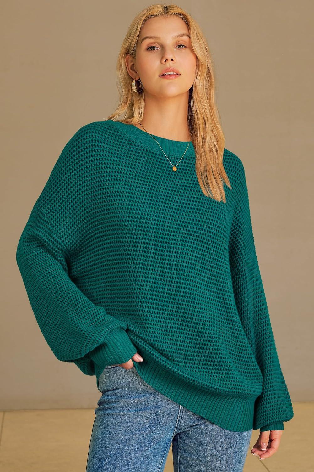 Arach&Cloz Women's Wool Blend Crewneck Fall Trendy Oversized Waffle Sweaters 2025(Dark Green)