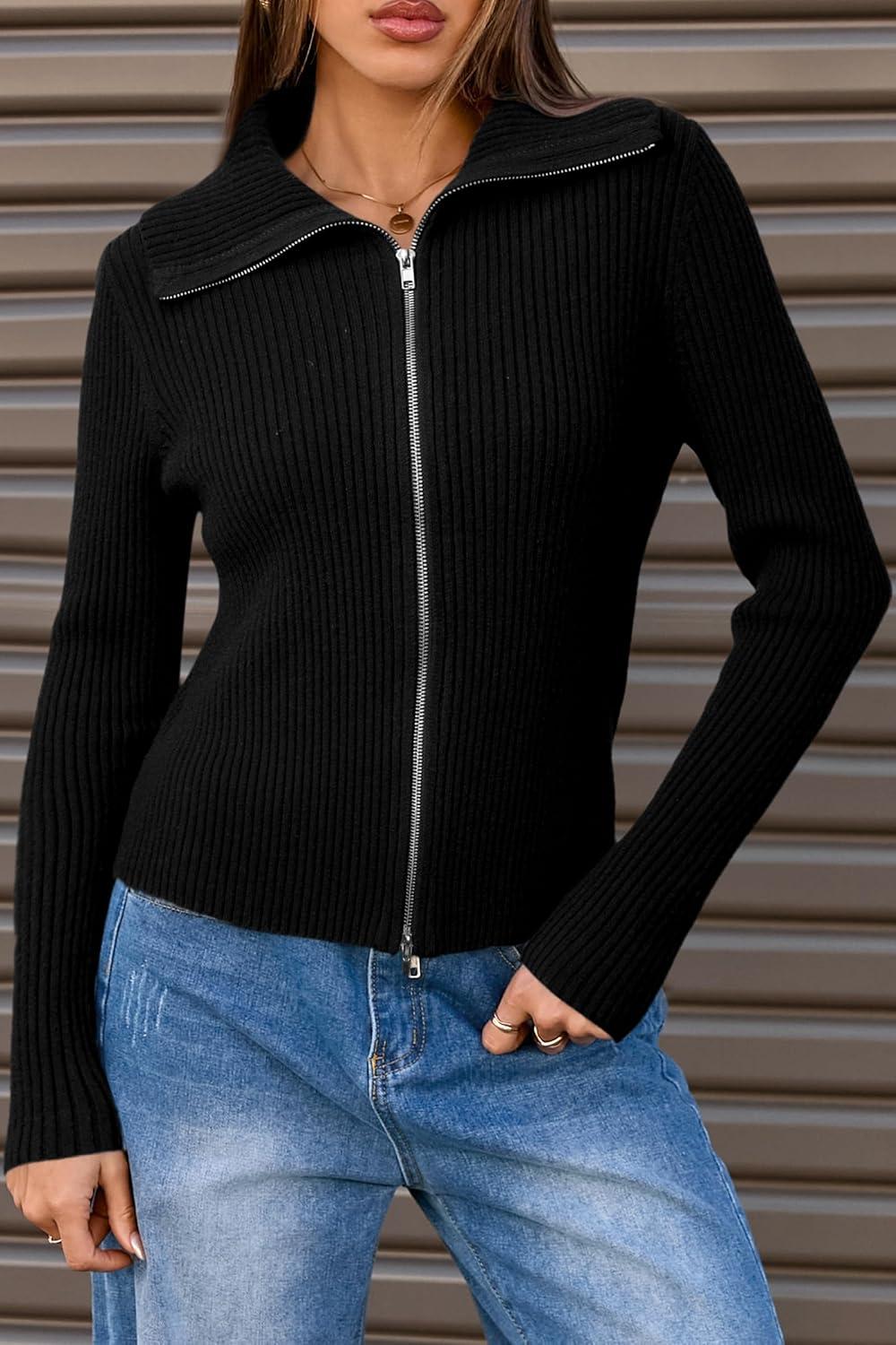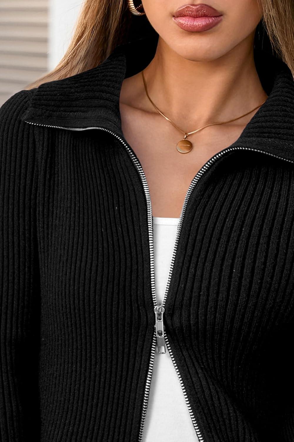Arach&Cloz Women’s Wool Blend Fall Zip Up Lapel Neck Business Cardigan Sweaters 2025(Black)