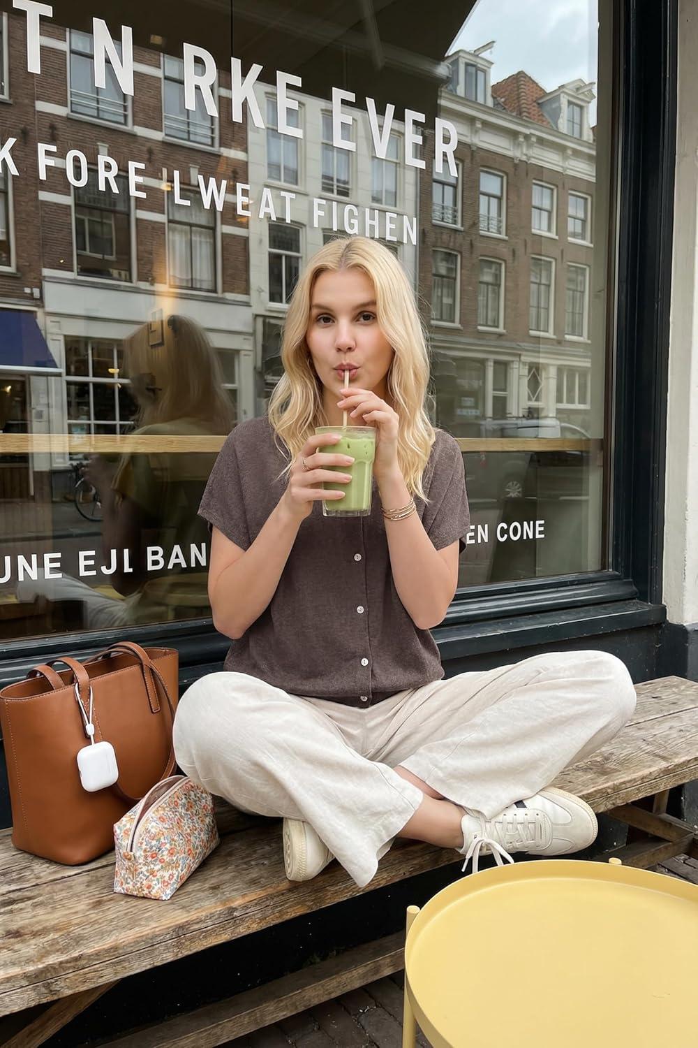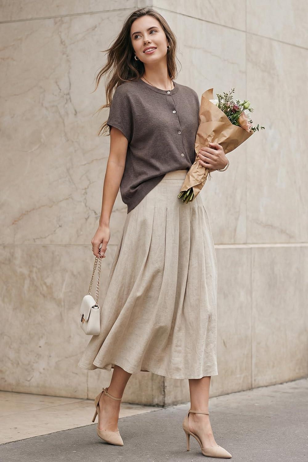 Arach&Cloz Women's Wool Blend Lightweight Cardigan Short Sleeve Summer Oversized Casual Sweaters Tops(Coffee)