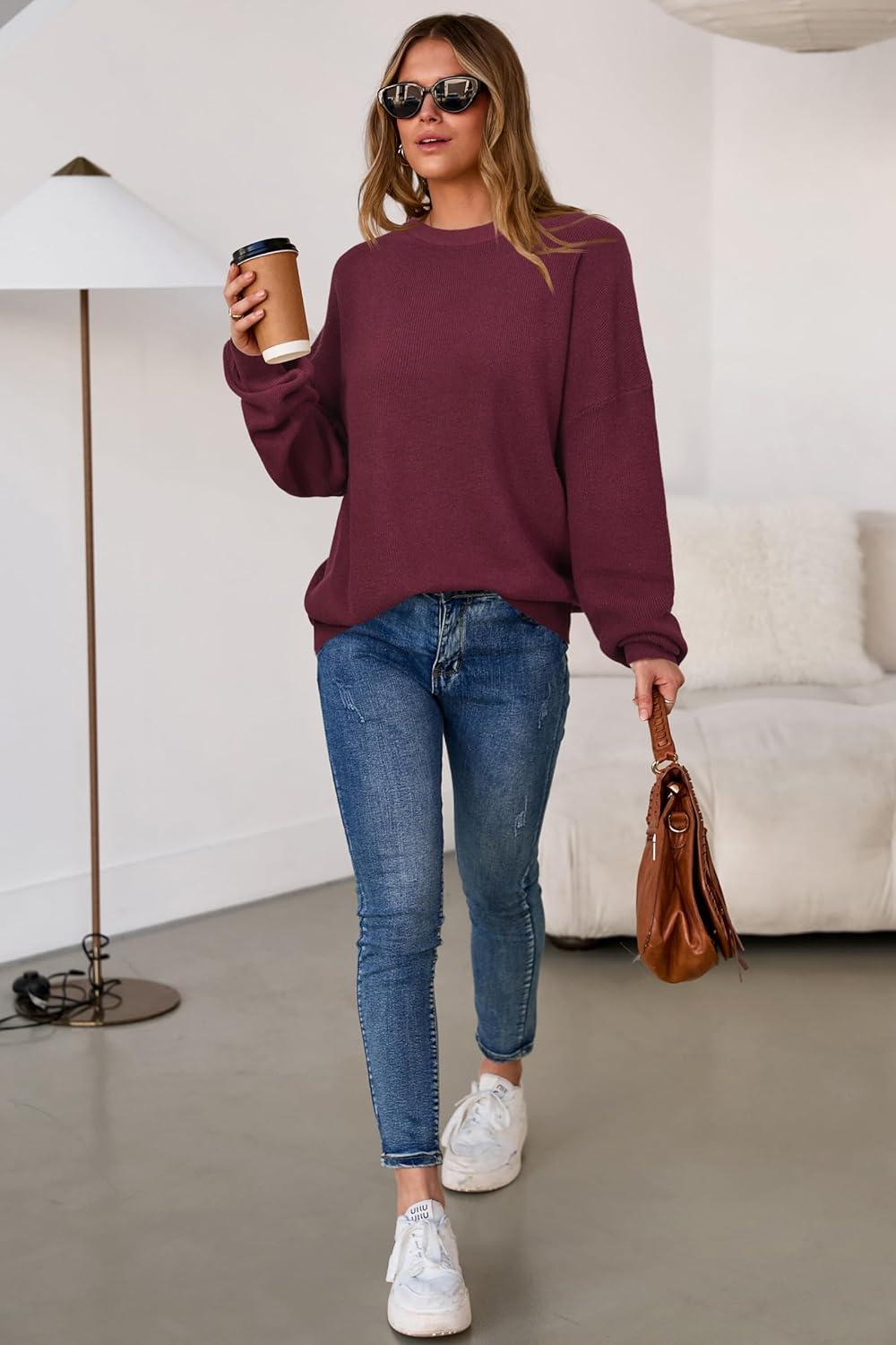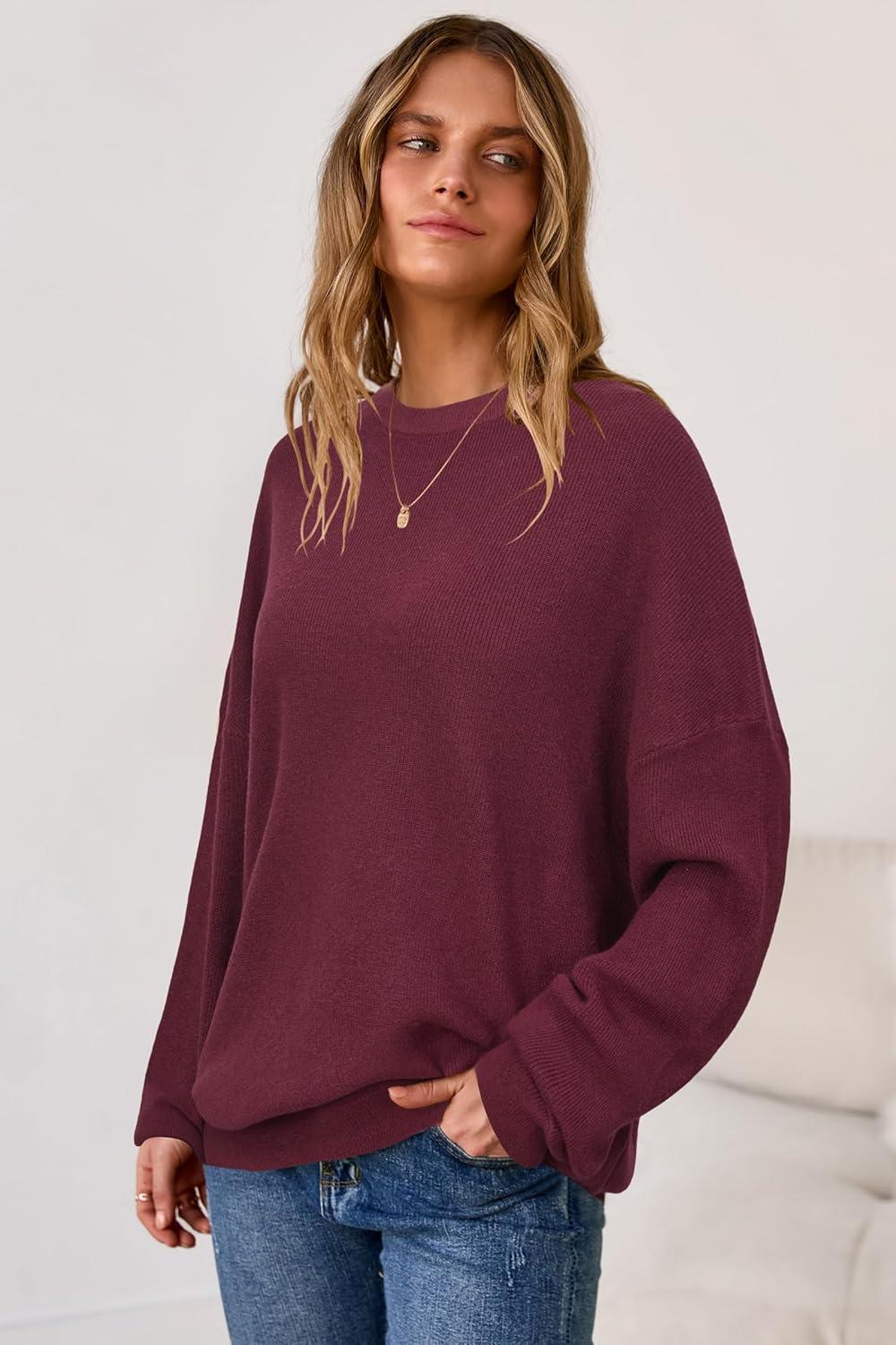 Arach&Cloz Women's Wool Blend Oversized Sweaters Crewneck Casual Fall Outfits Fashion Tops(Burgundy)