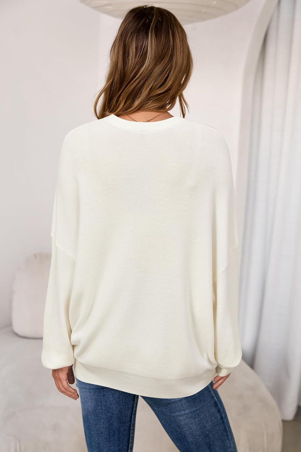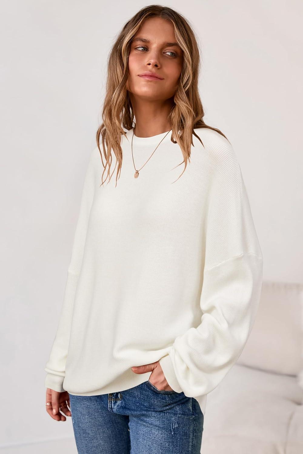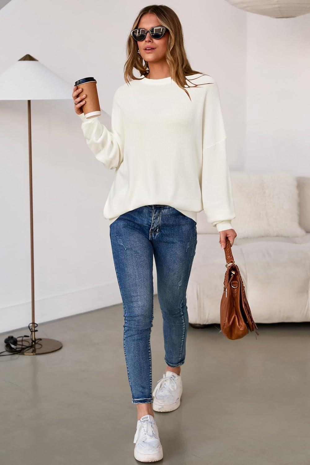 Arach&Cloz Women’s Wool Blend Oversized Sweaters Crewneck Casual Fall Outfits Fashion Tops(White)