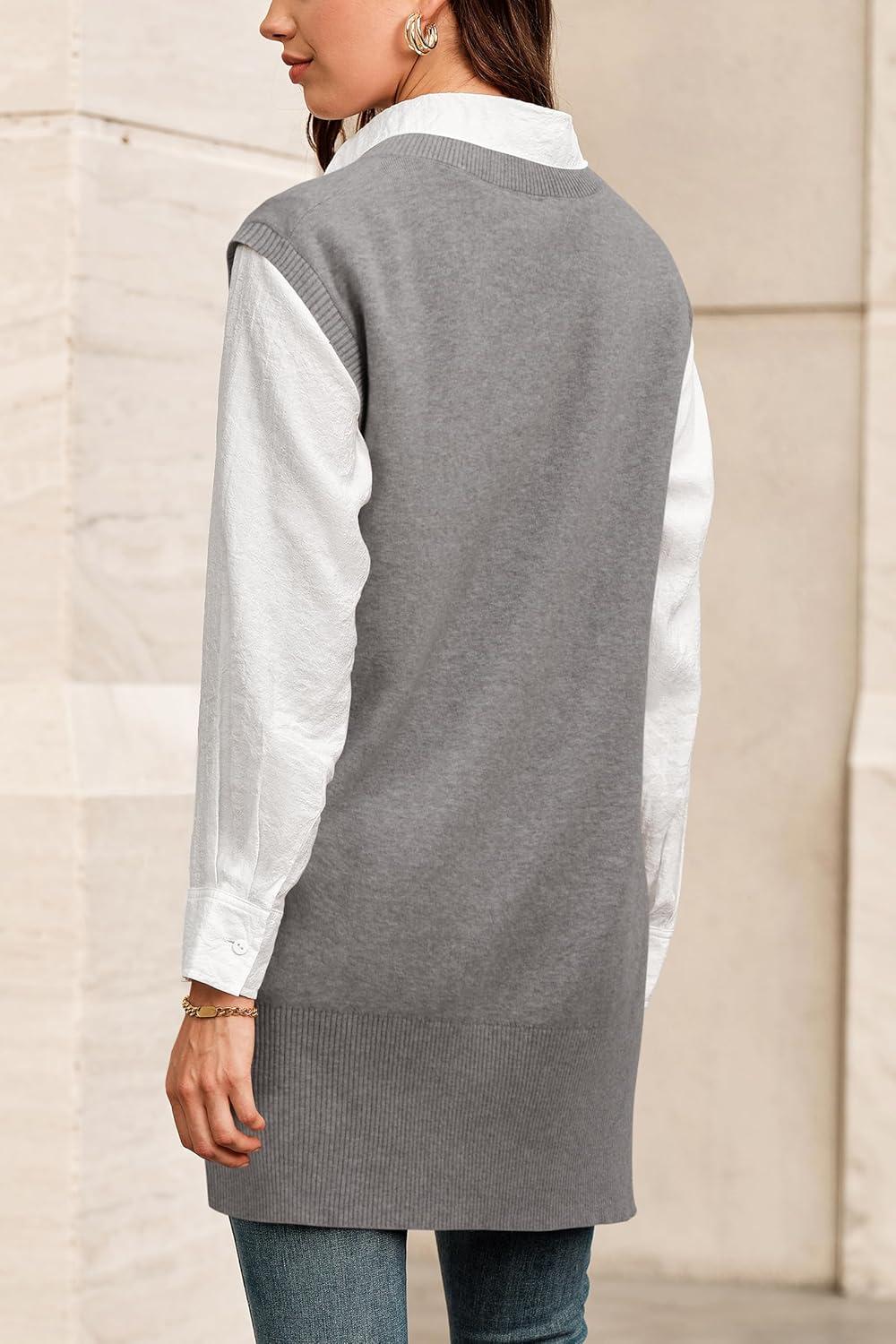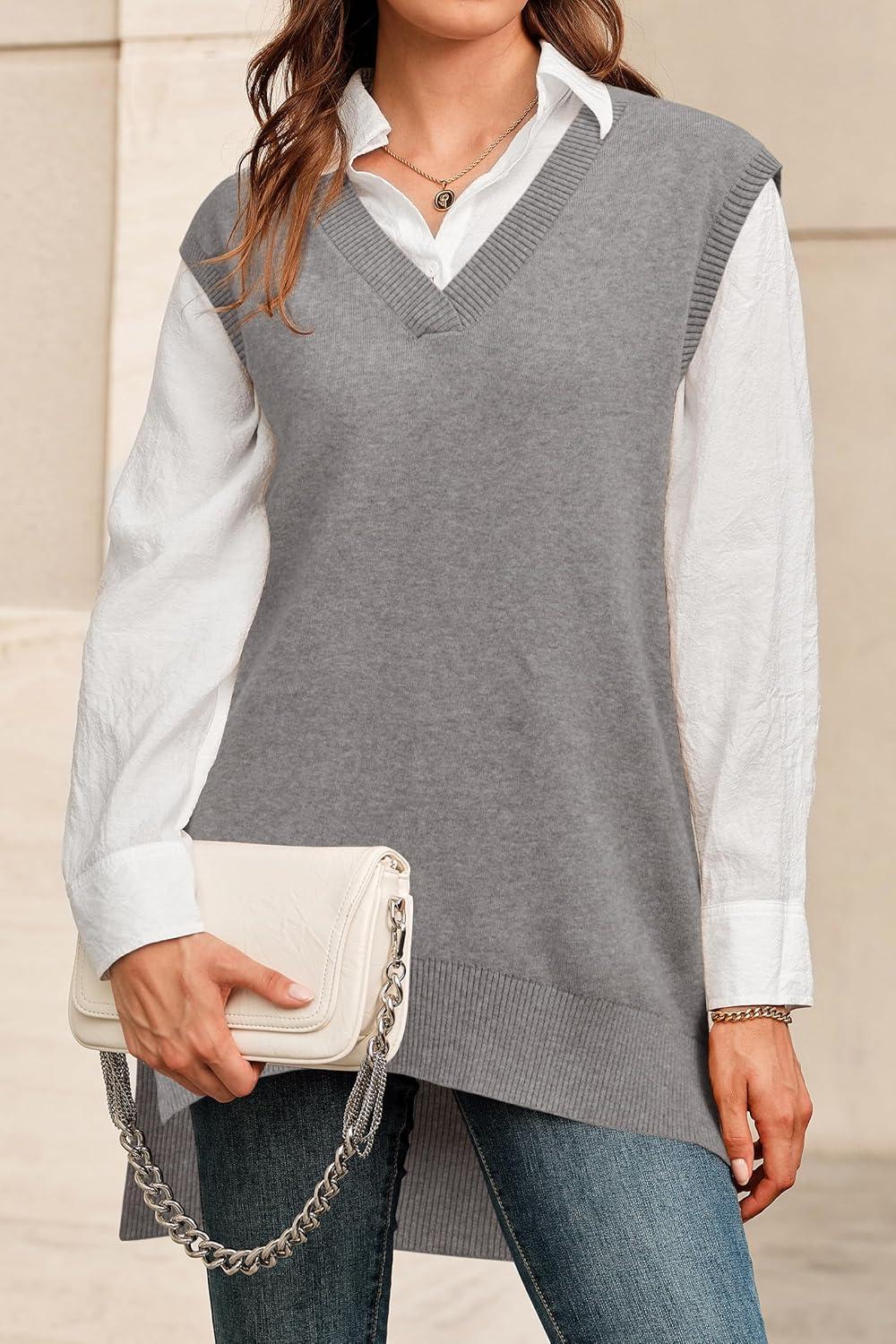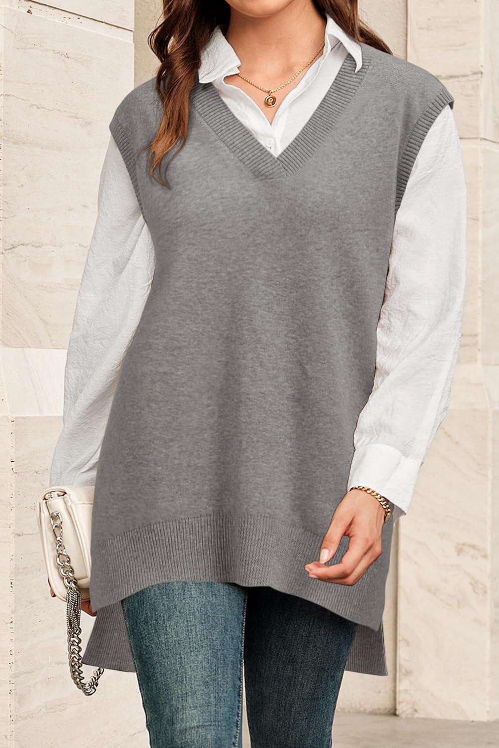 Arach&Cloz Women’s Wool Blend Side Slit High Low Versatile V Neck Fall Sweater Vests 2025(Grey)