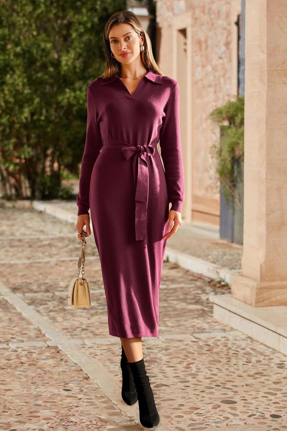 Arach&Cloz Women’s Wool Blend Side Slit Polo Sweater Dresses 2025 Fall Business Casual Outfits(Burgundy)