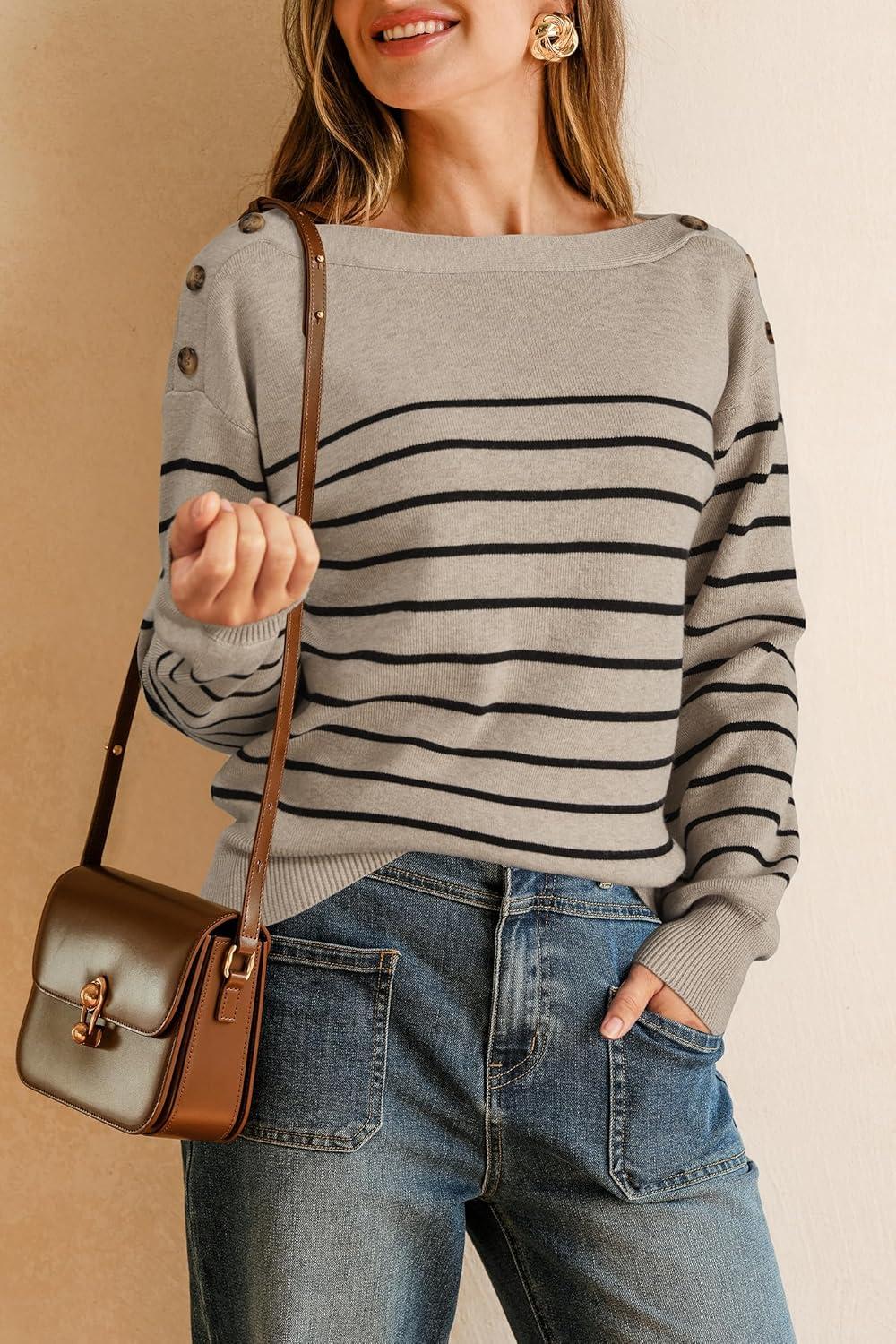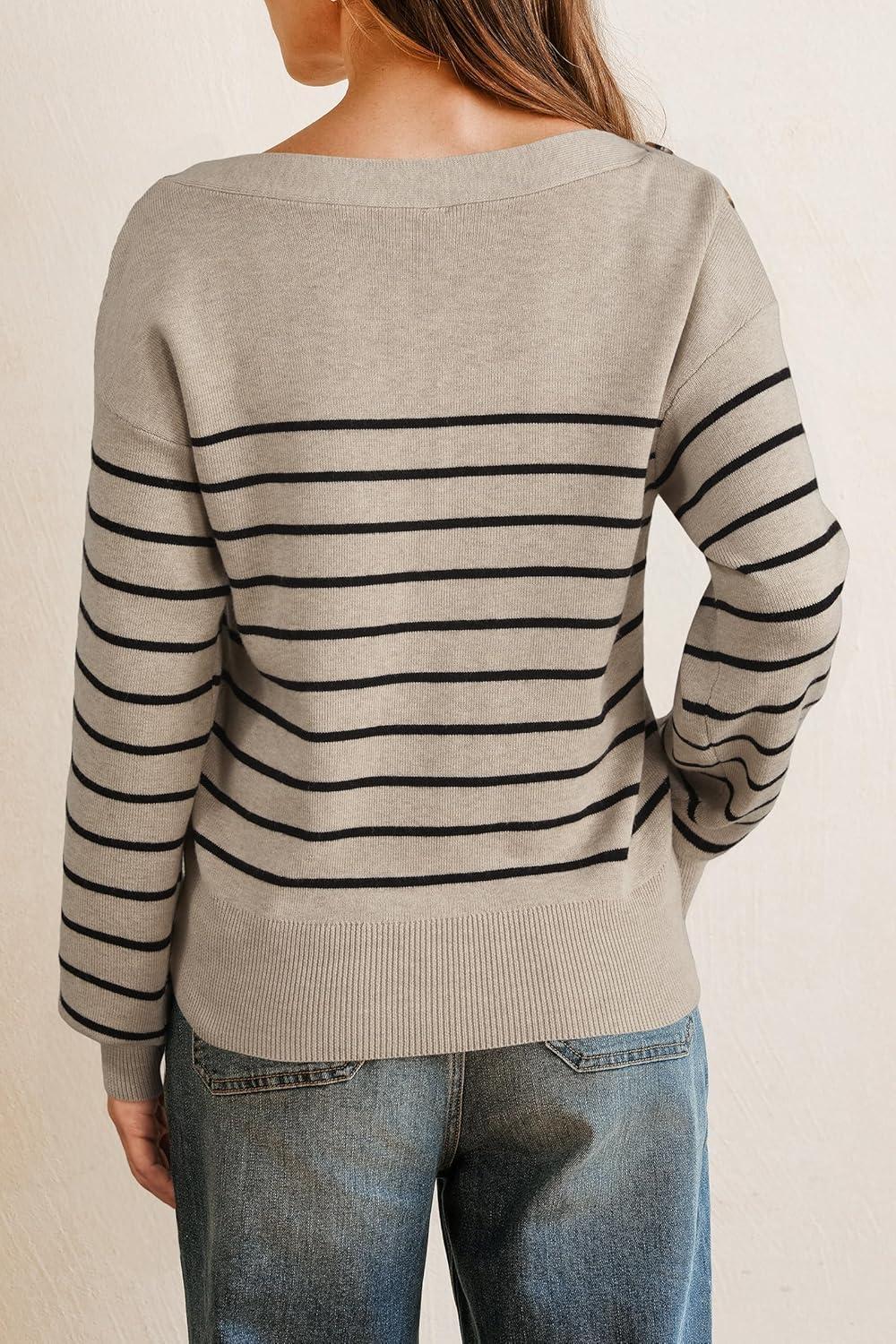Arach&Cloz Women’s Wool Blend Striped Boat Neck Fall Dressy Casual Sweater Tops 2025(Khaki and Black)