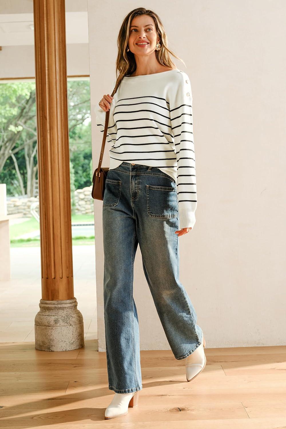Arach&Cloz Women’s Wool Blend Striped Boat Neck Fall Dressy Casual Sweater Tops 2025(Navy Blue and White)