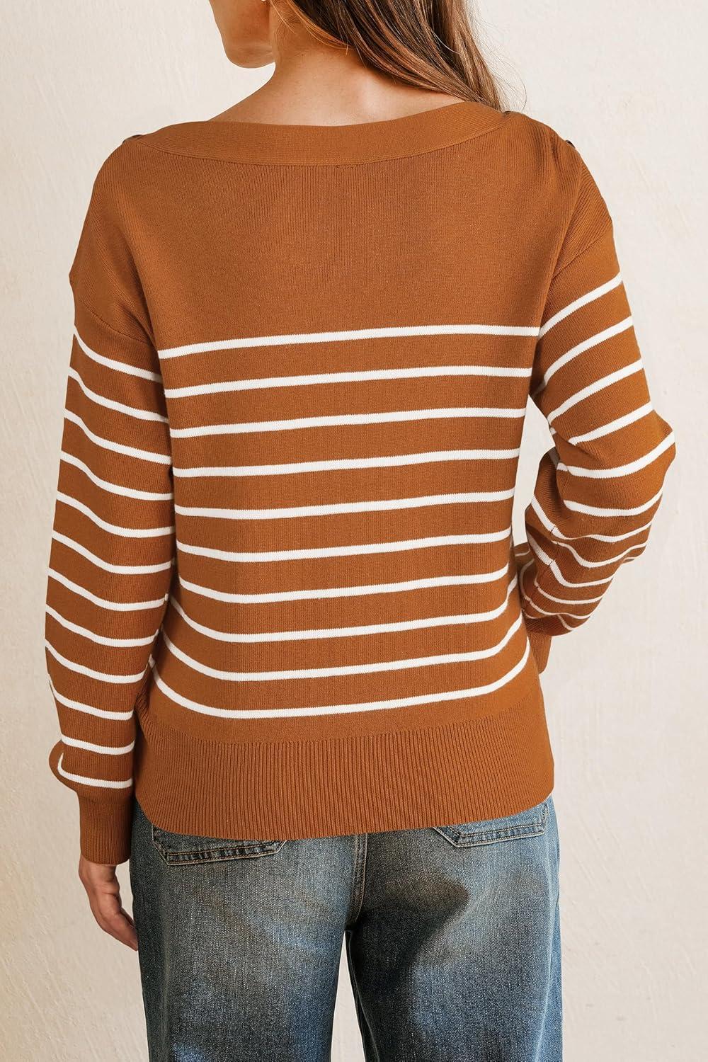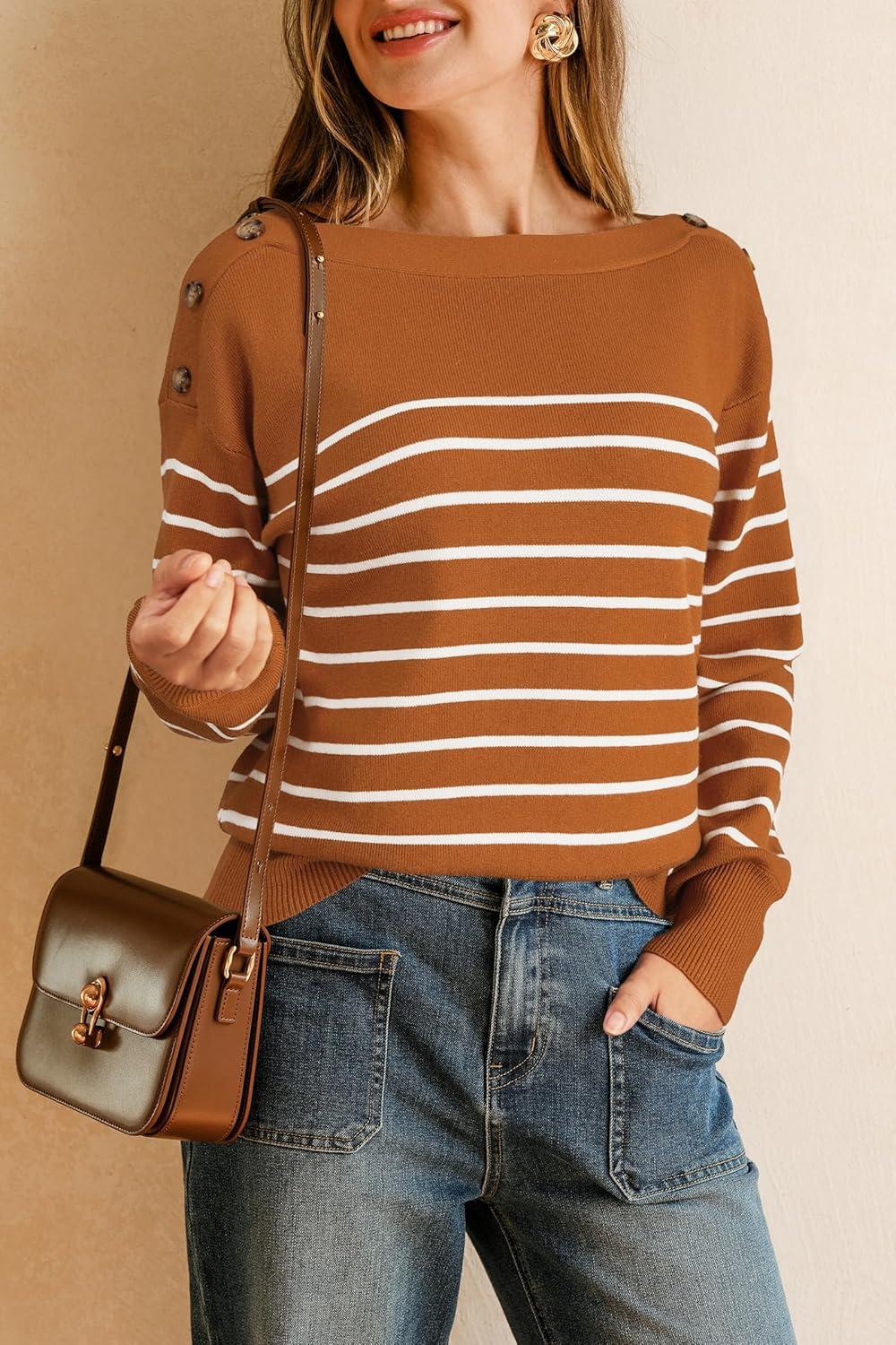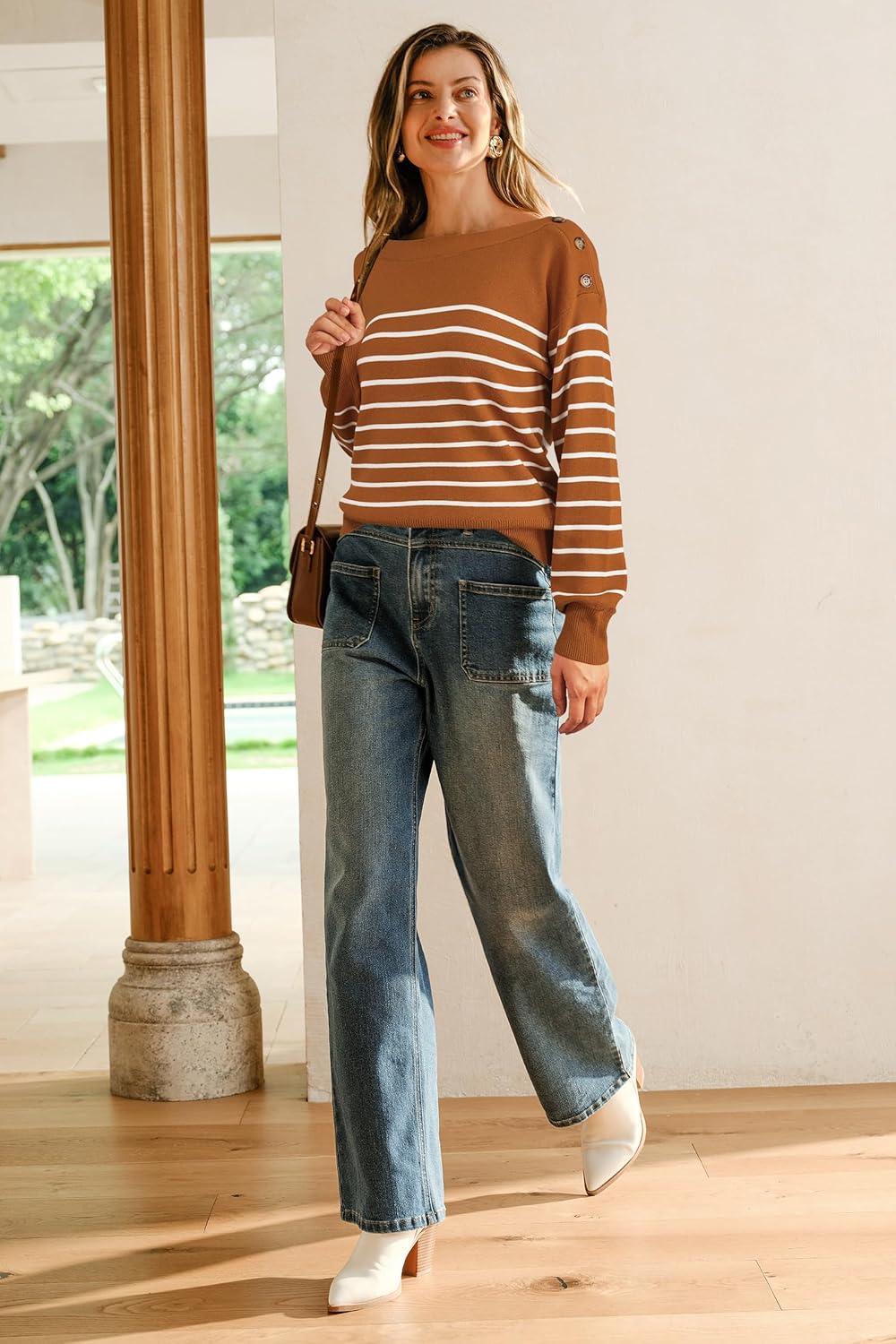 Arach&Cloz Women’s Wool Blend Striped Boat Neck Fall Dressy Casual Sweater Tops 2025(Khaki and Black)
