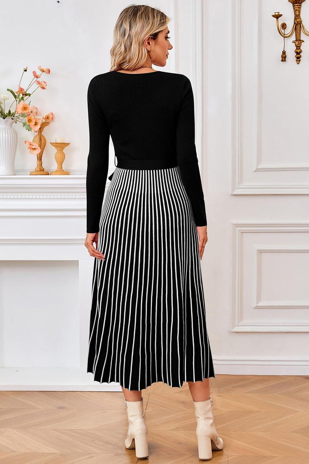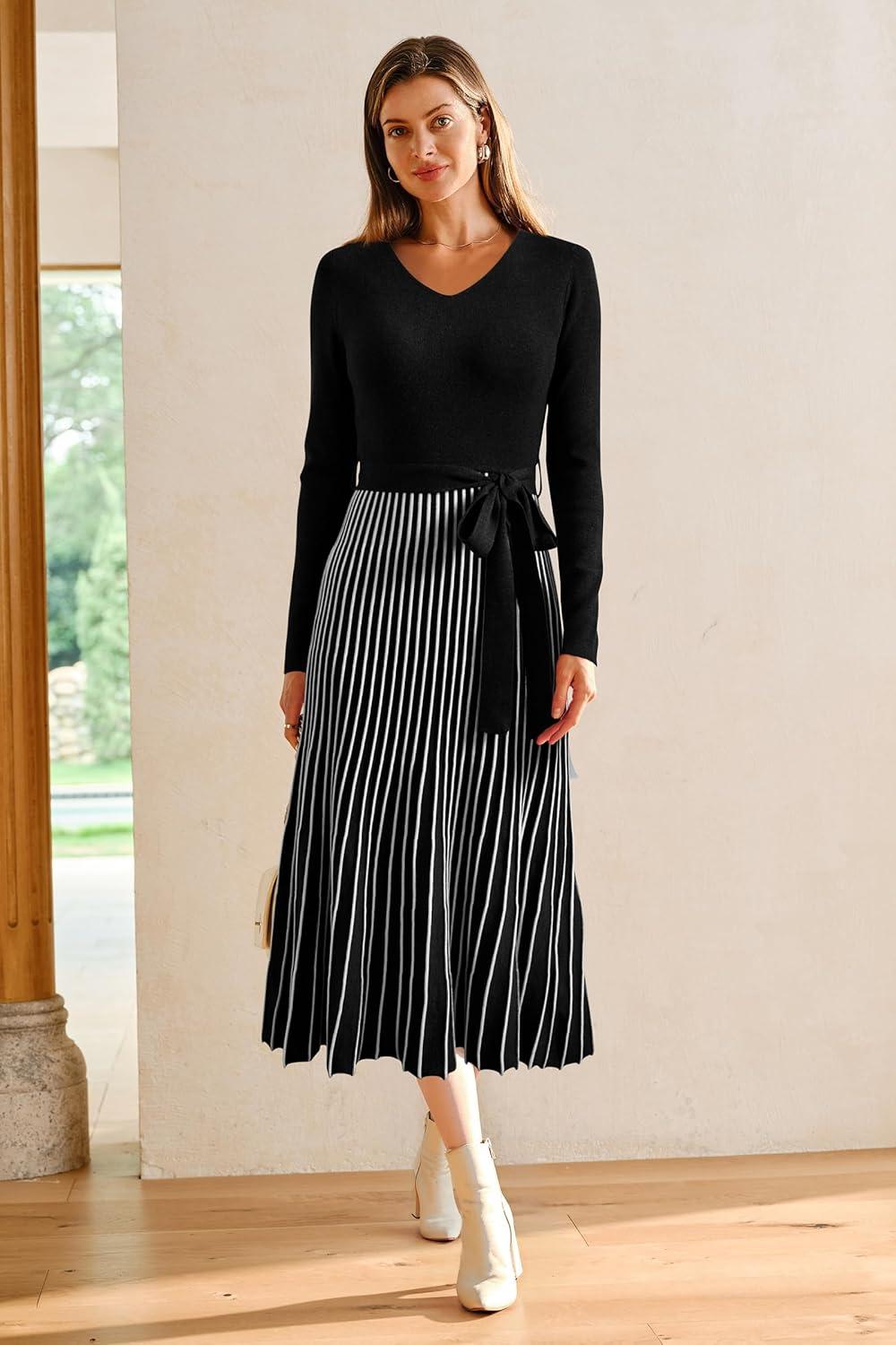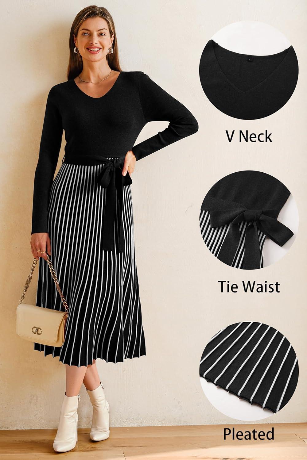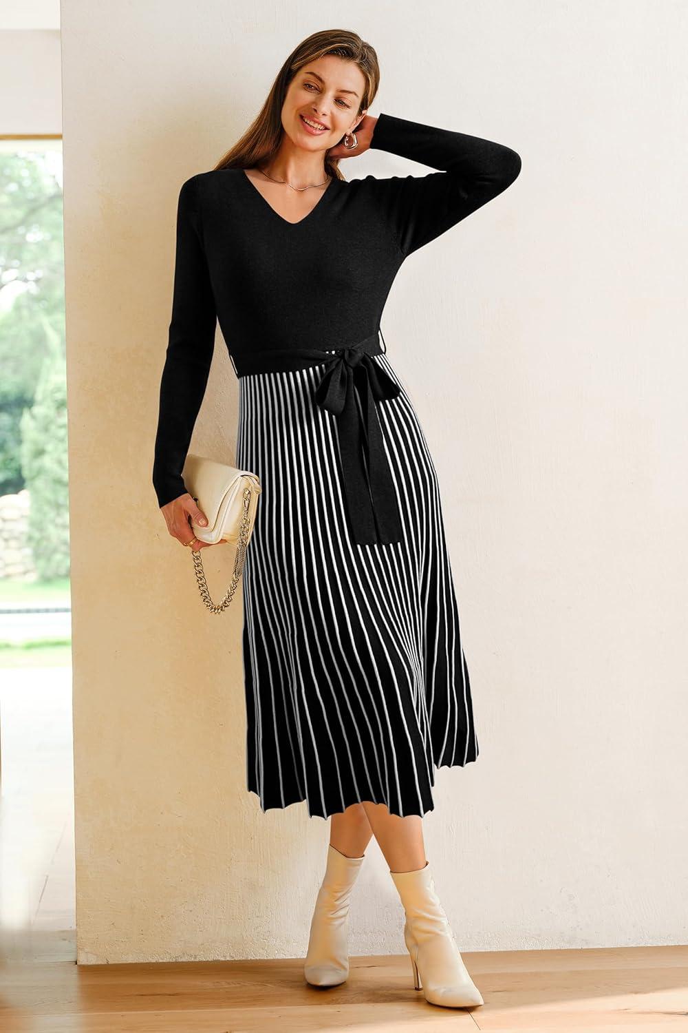 Arach&Cloz Women’s Wool Blend Tie Waist Pleated Fall Sweater Dress 2025(Black-white Stripe)