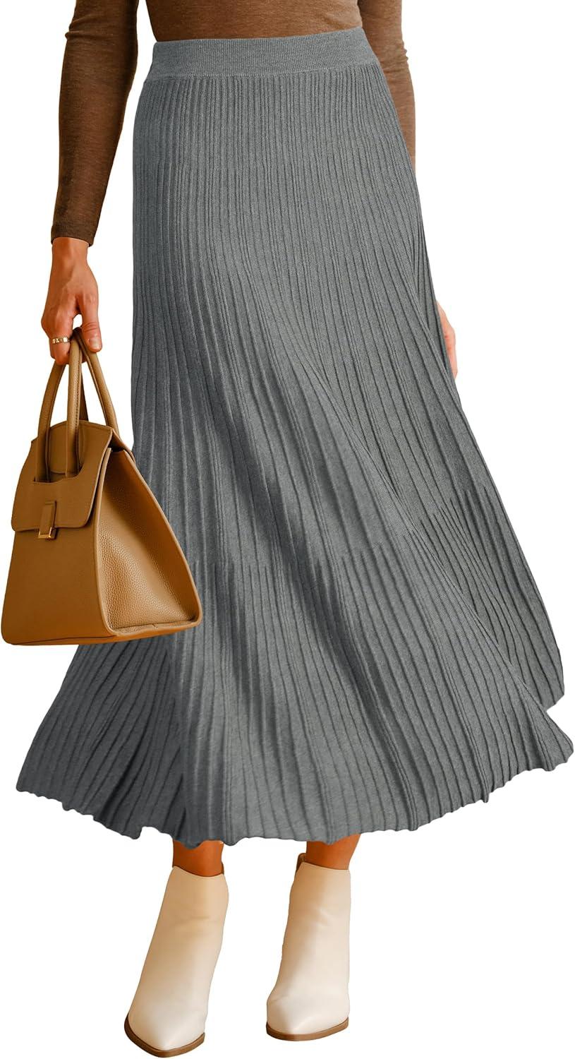 Arach&Cloz Women’s Wool Blend Wide Elastic Band A-Line Pleated Flowy Long Skirts 2025(Grey)